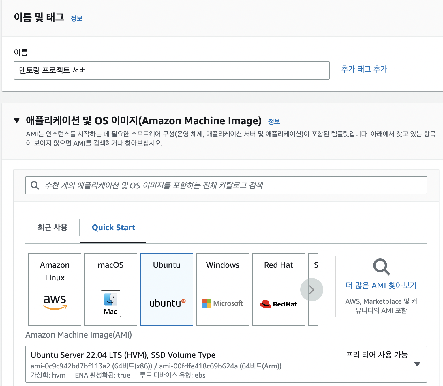 애플리케이션 및 OS 이미지는 Amazon Linux를 선택해도 되고, Ubuntu를 선택해도 됩니다. 저는 흔히 사용하는 Ubuntu를 주로 사용합니다.