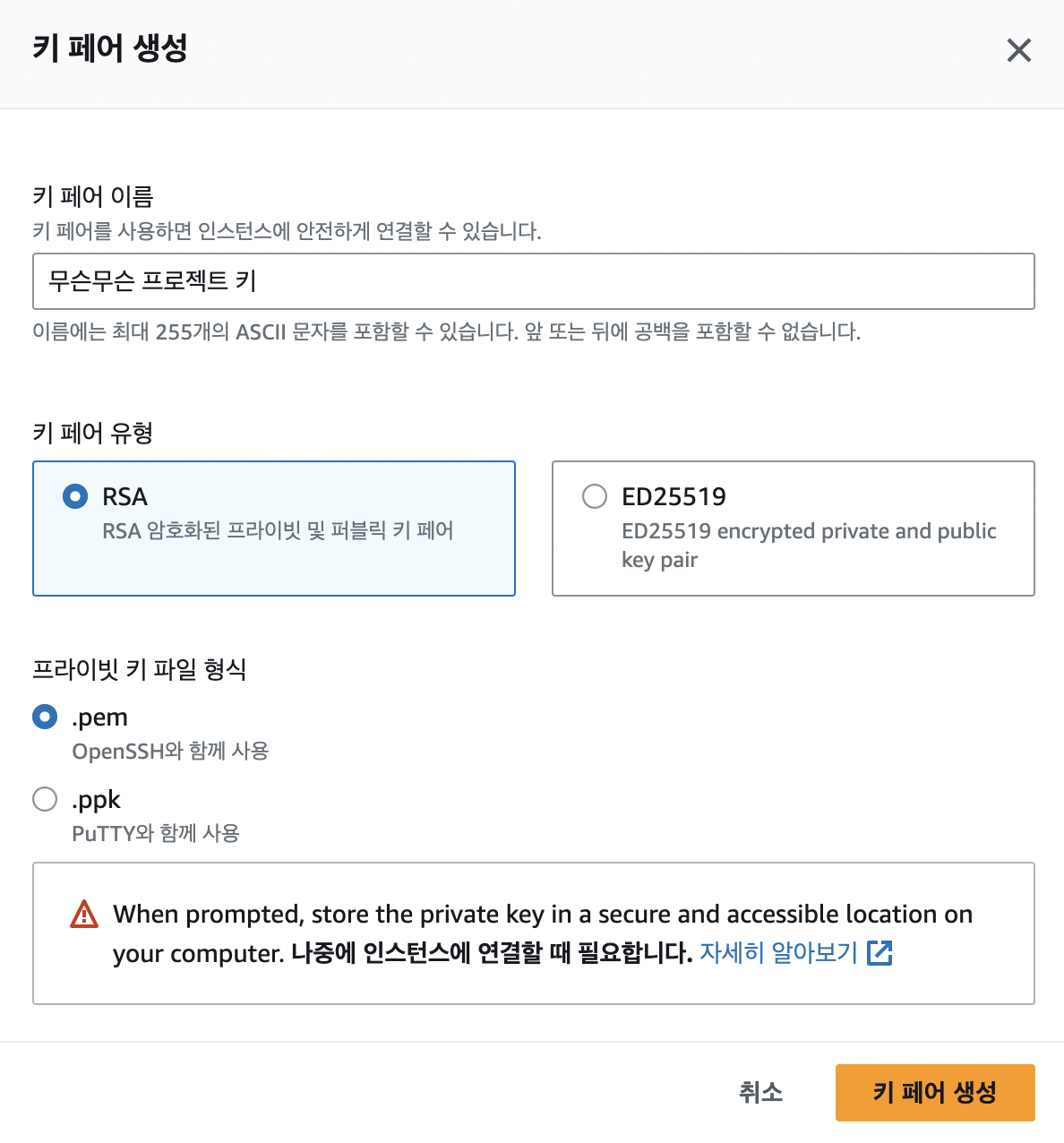 처음 EC2를 만드는 것이라면 키 페어가 없을 겁니다. 키 페어 생성 버튼을 눌러서 키 페어를 생성해줍시다.