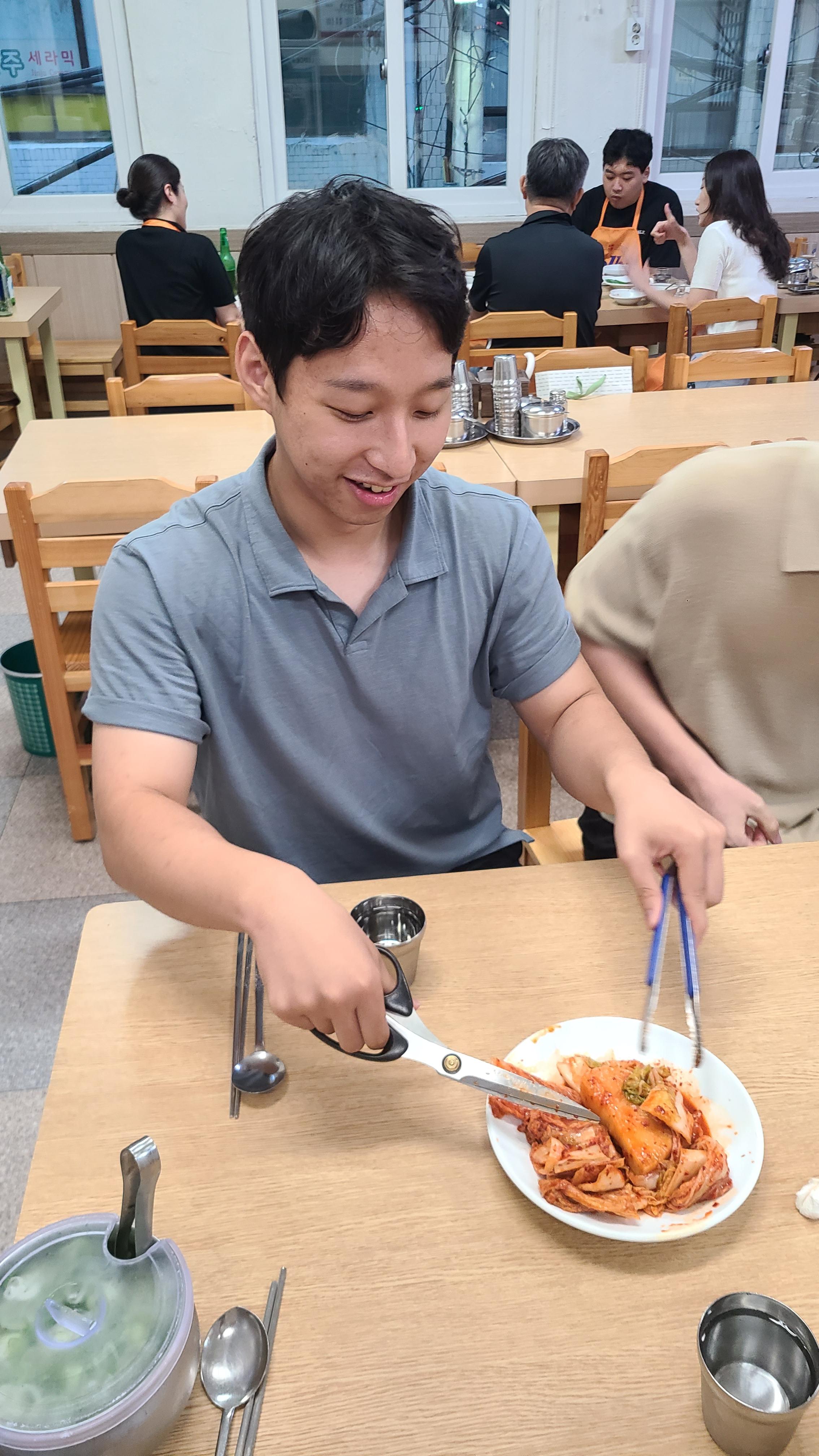 세로로 김치를 썰어주는 맛잘알 주홍이