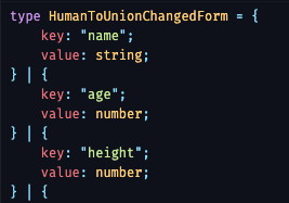 그래서 객체 뒤에 [keyof Object] 를 붙이면 유니온 타입으로 도출된다는 점에 착안하여 다음과 같이 타입을 만들 수 있었다.
