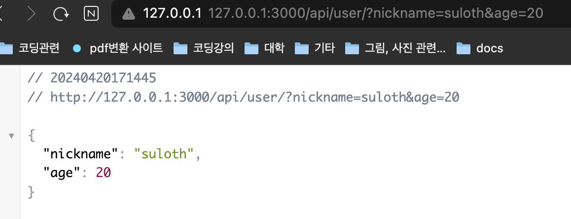 http://127.0.0.1:3000/api/user?nickname=suloth&age=20 을 브라우처에 주소창에 적고 요청을 보내면 다음과 같이 응답한다. (? 앞에 /가 있어도 된다)