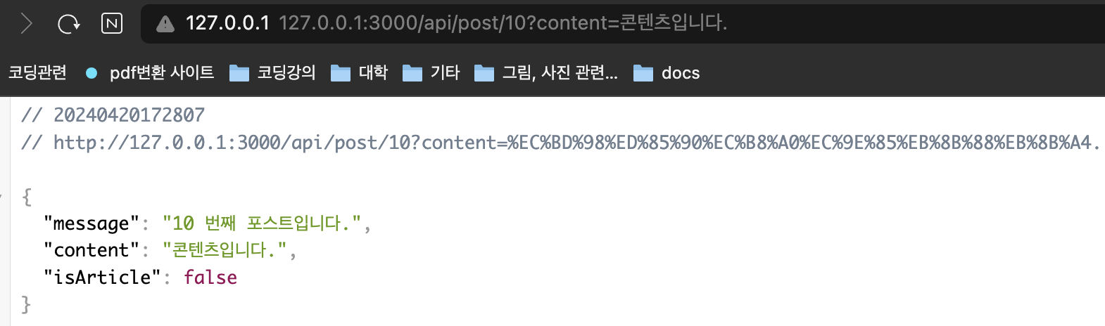 그리고 서버를 실행시키고, http://127.0.0.1:3000/api/post/10?content=콘텐츠입니다. 라는 url을 브라우저에 입력하면, 다음과 같은 결과를 받아볼 수 있다.