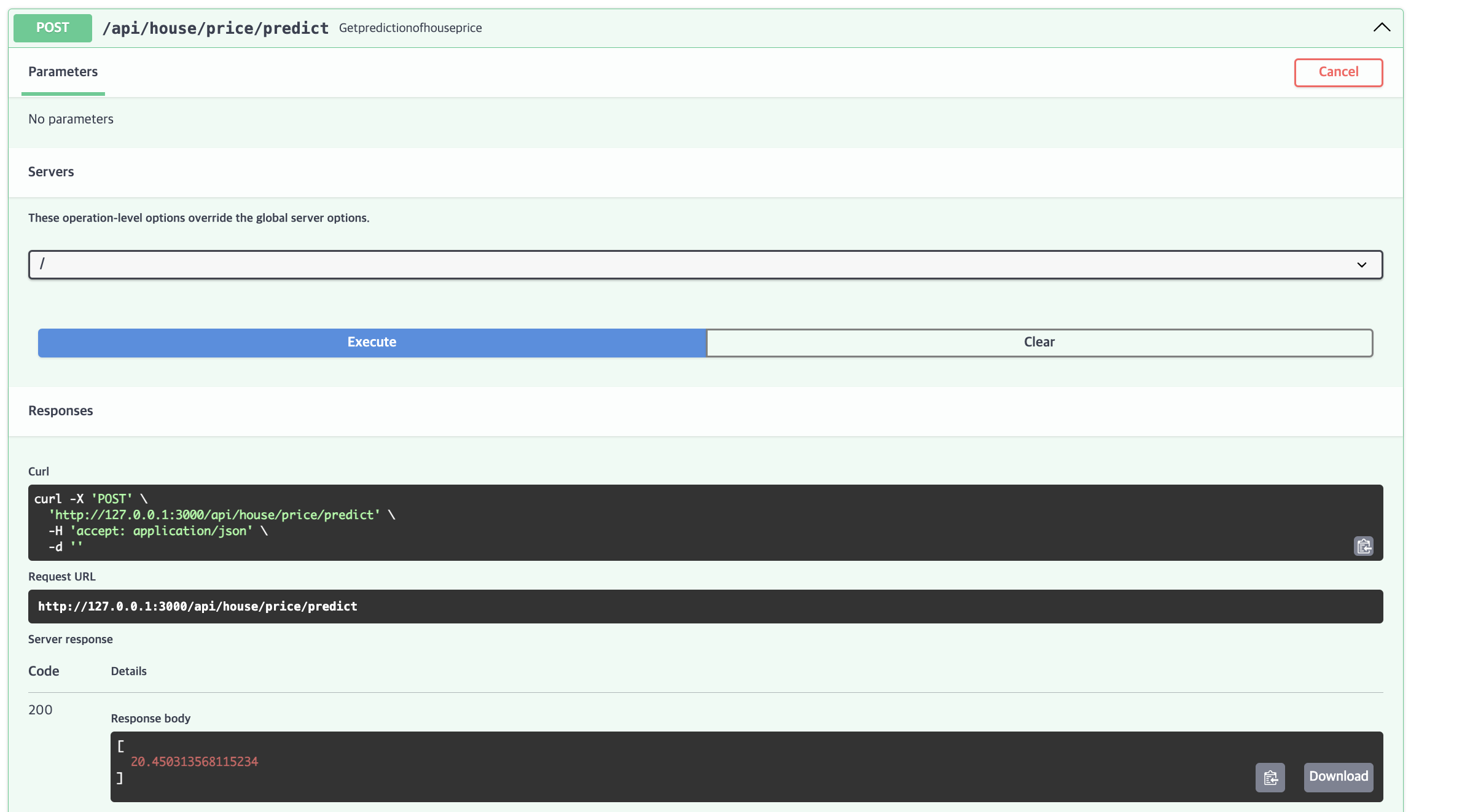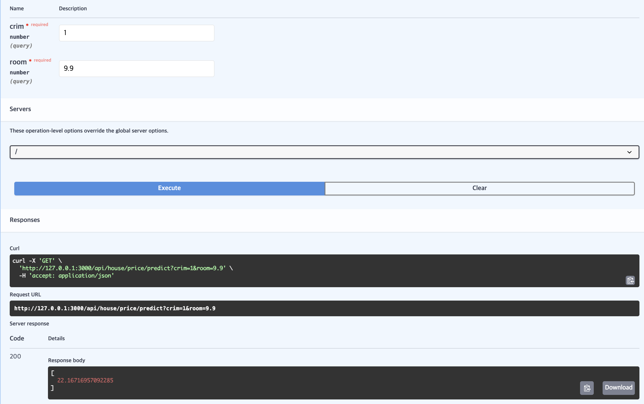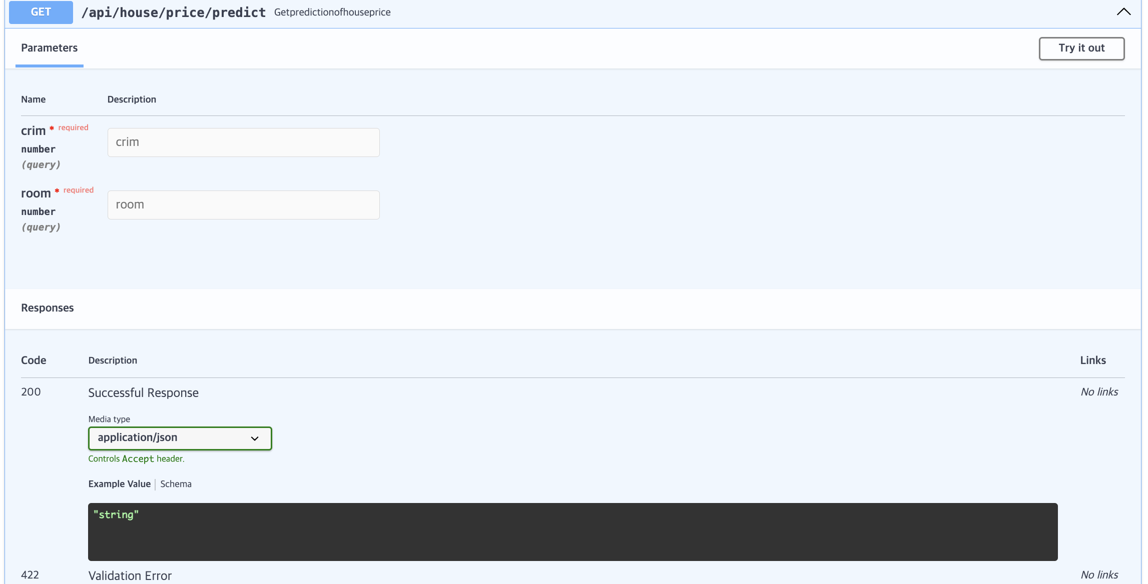 지금까지는 Parameter를 서버에서 설정해서 집 값을 예측했기 때문에 Swagger에 항상 고정된 return 값만 나왔다.