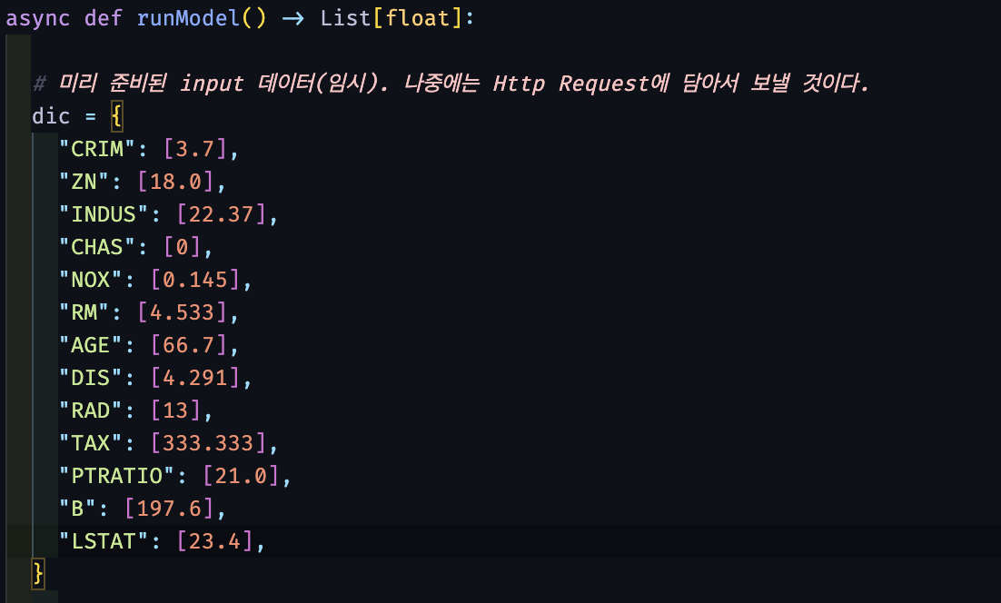 이번에는 @router.get 말고 @router.post를 사용해서 crim과 room말고 다른 모든 속성들을 post의 body로 받아서 예측하도록 api를 만들어보자.