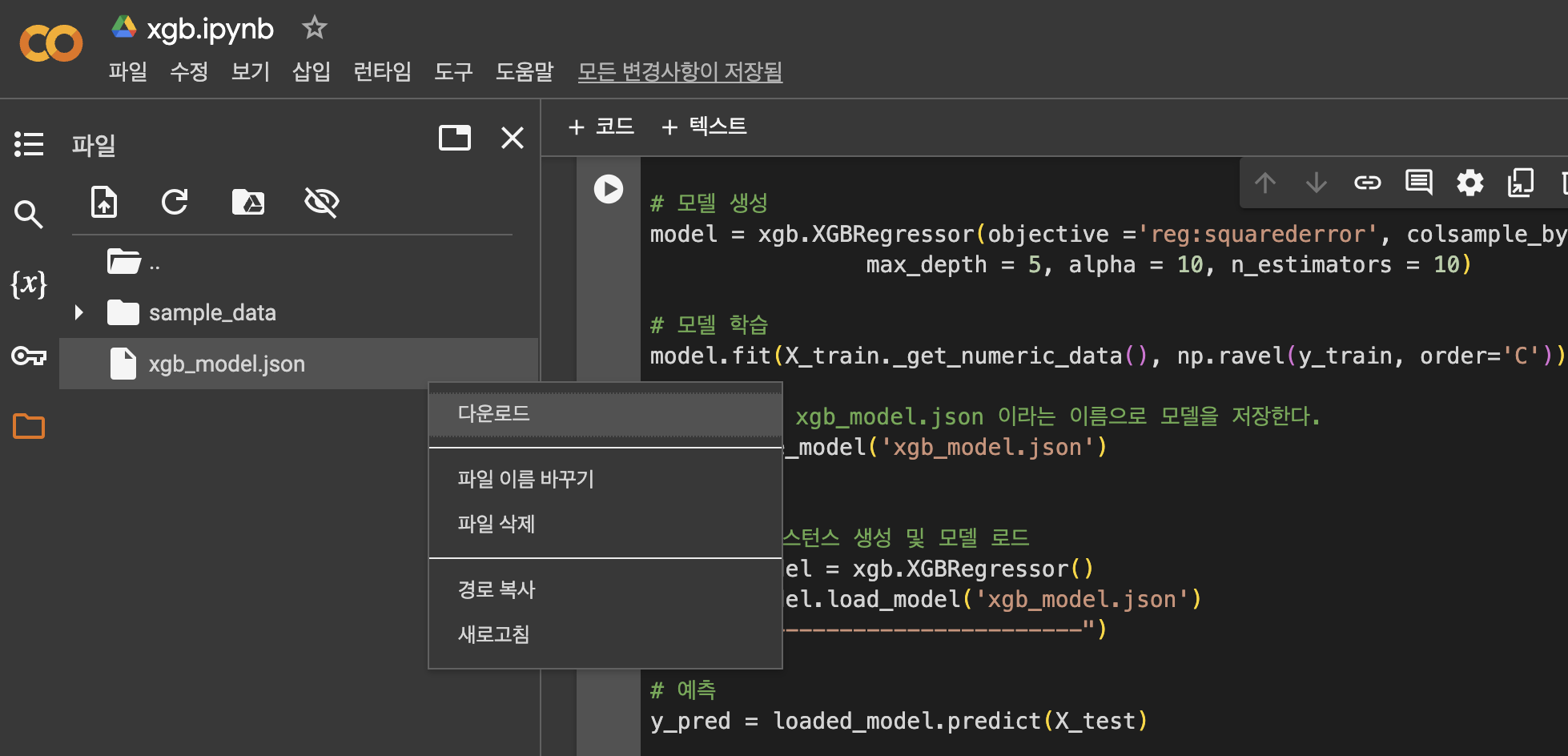 코드를 돌리고 나서, 파일 목록을 보면 xgb_model.json이라는 파일이 있을 텐데, 해당 파일을 다운로드 해주자.