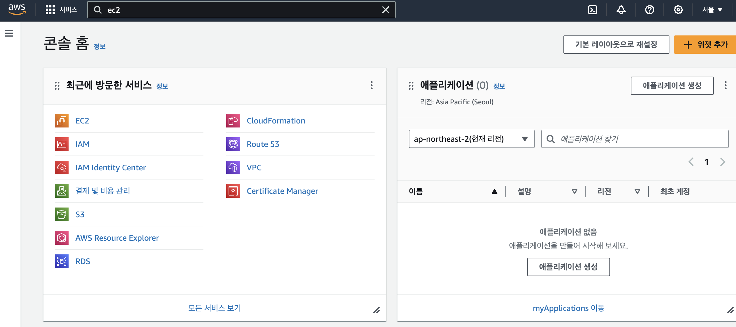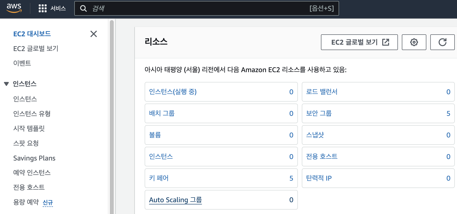 AWS에 로그인을 하고 왼쪽 위 검색창에 ec2를 입력해서 EC2 서비스를 클릭하자.