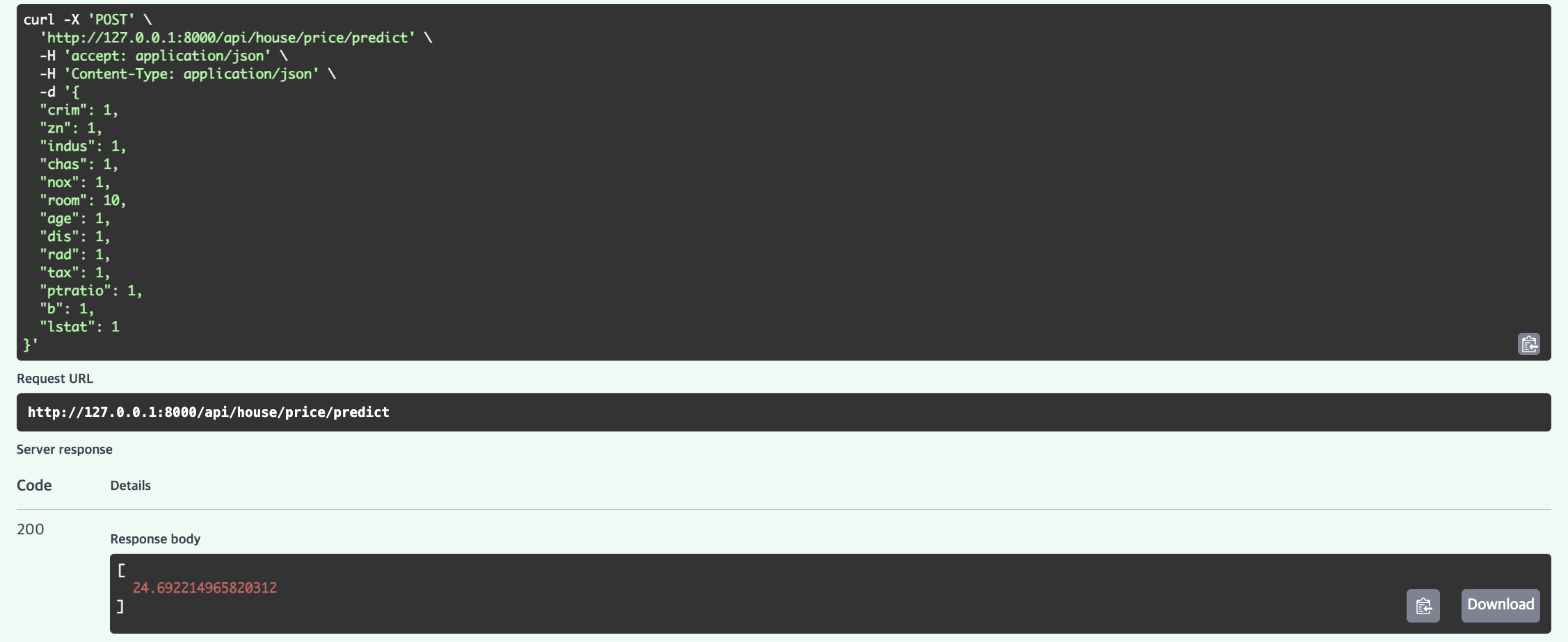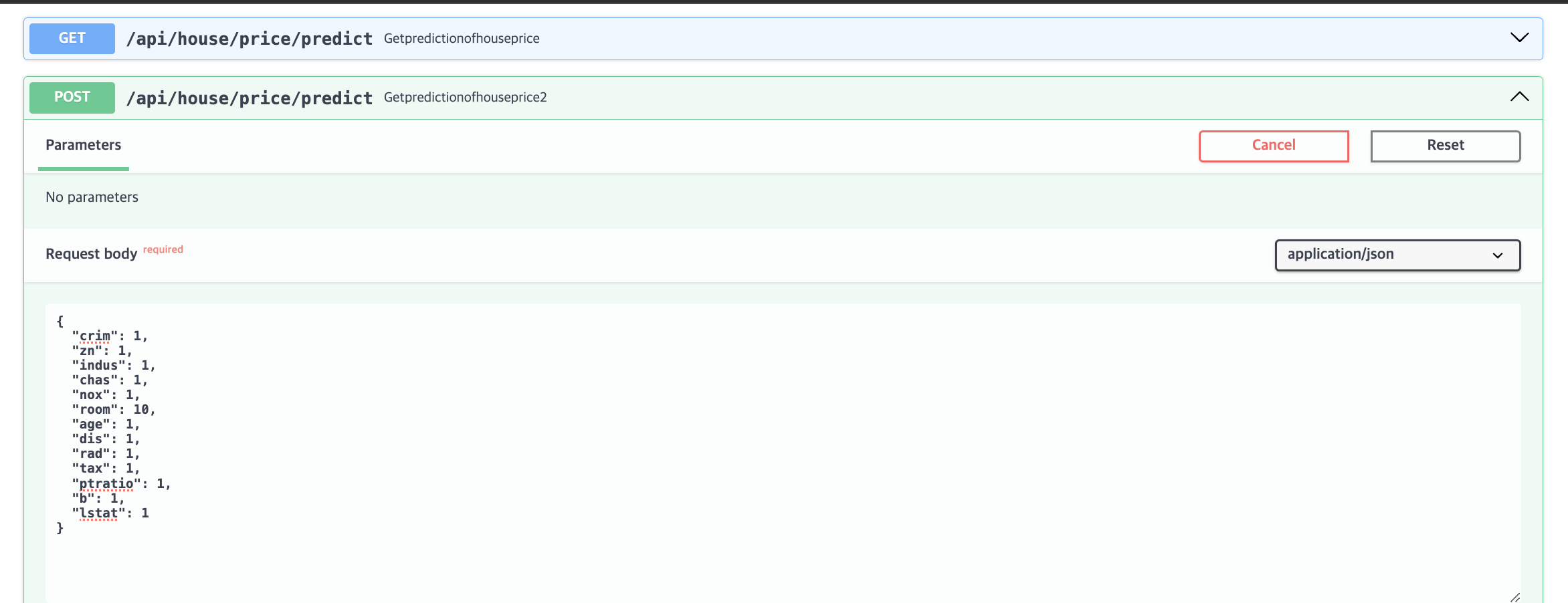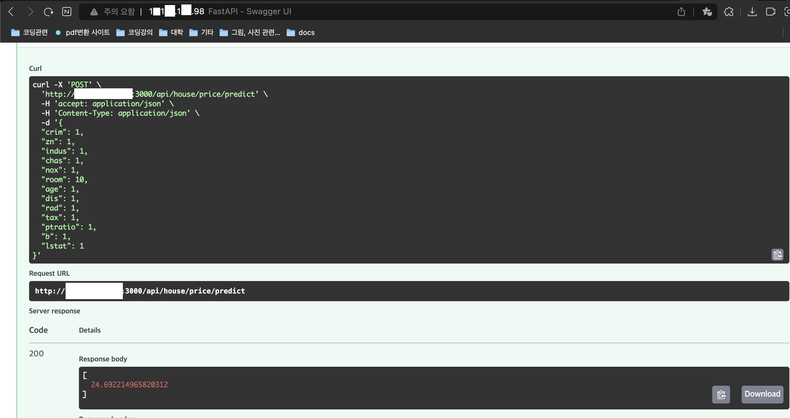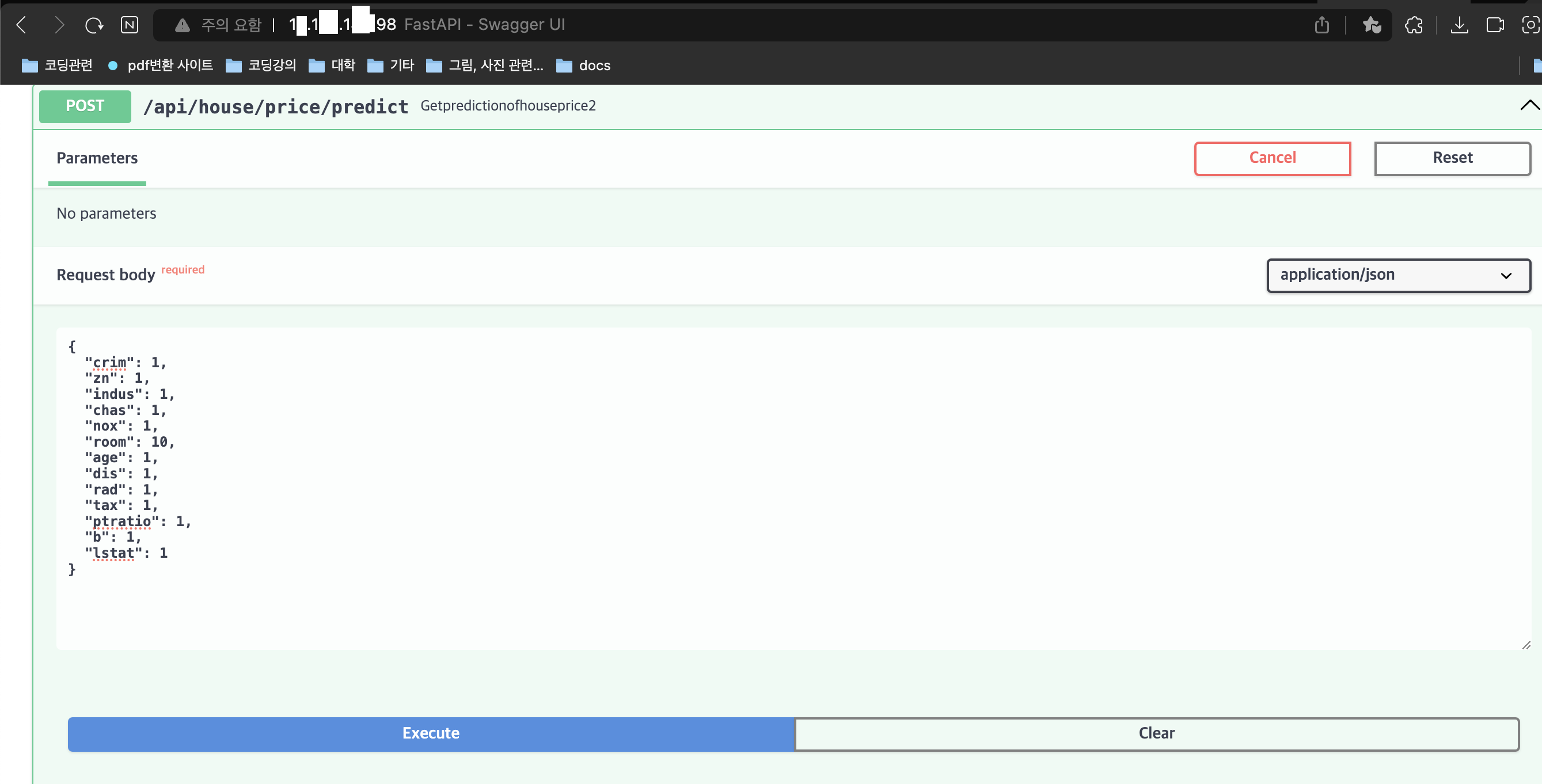 그리고 스웨거를 실행시켜보면 (여기서는 Post /api/house/price/predict 를 실행시켜보겠다)
