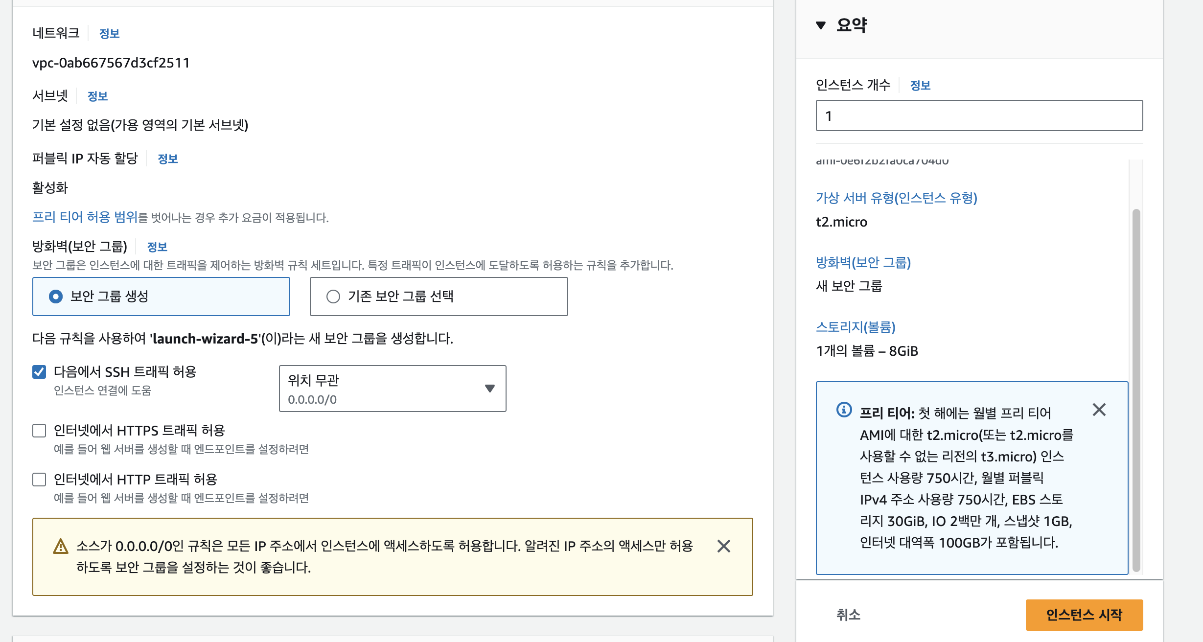 인스턴스 유형은 t2.micro(프리 티어 사용 가능으로)