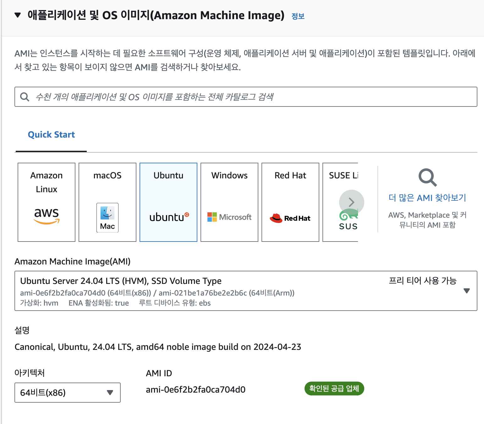 애플리케이션 및 OS 이미지를 Ubuntu로 설정해주고, Ubuntu Server 24.04 LTS 로 해주자. (프리 티어 사용 가능)
