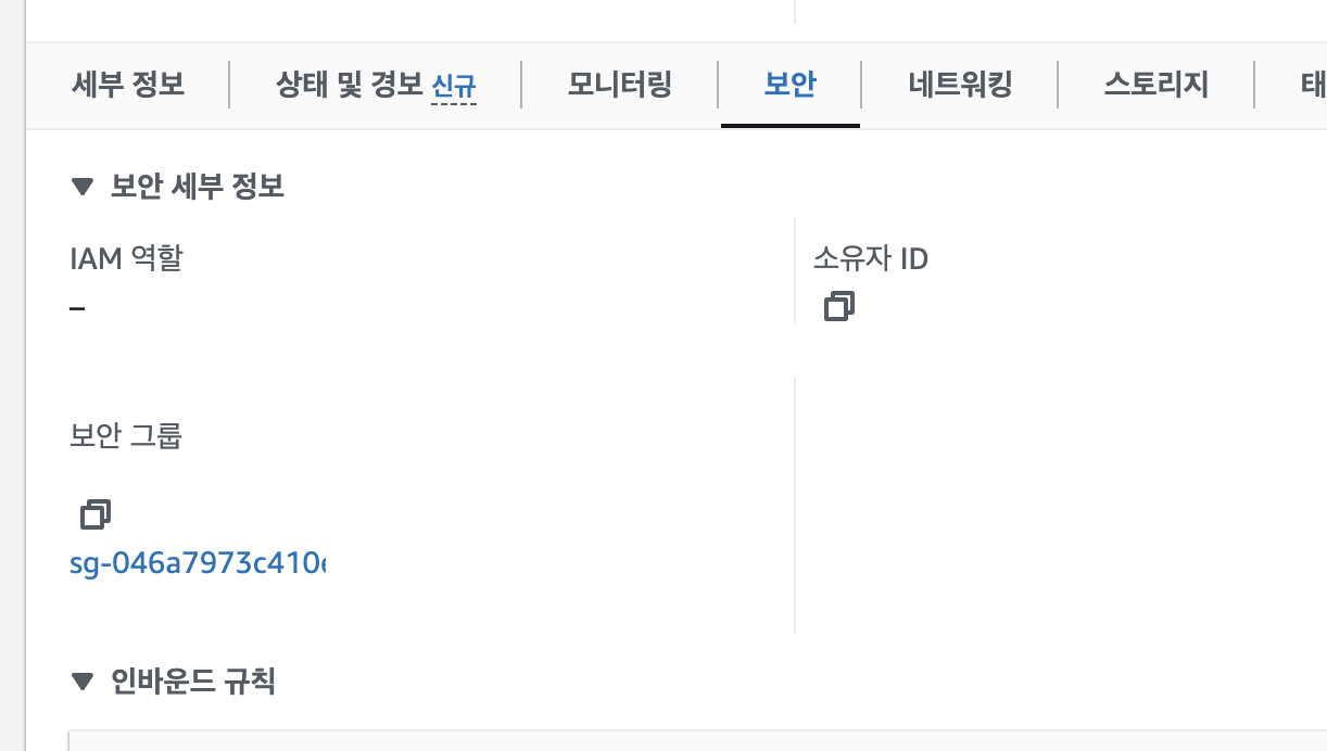 여기서 보안 그룹에 있는 링크(sg-046a7973c410...)를 클릭하자.