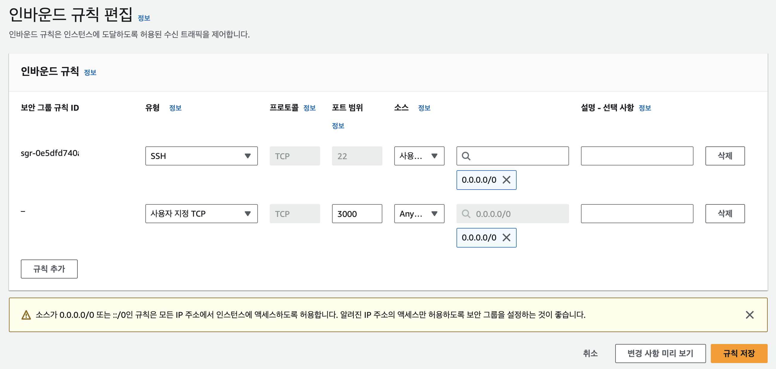 이 규칙의 의미는, TCP로 들어오는 요청은 3000번 포트로 들어오는 것만 허락하는데, 그 요청에 어떤 ip에서 온 것이든 다 허용(0.0.0.0/0)한다는 뜻이다. (0의 의미는 all이라고 생각하자)