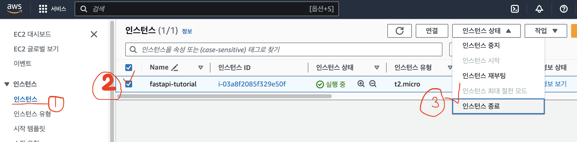 그리고 삭제하고 싶은 인스턴스를 체크해주고 인스턴스 상태 -> 인스턴스 종료 버튼을 누르면 몇 분 이내에 삭제가 될 것이다.