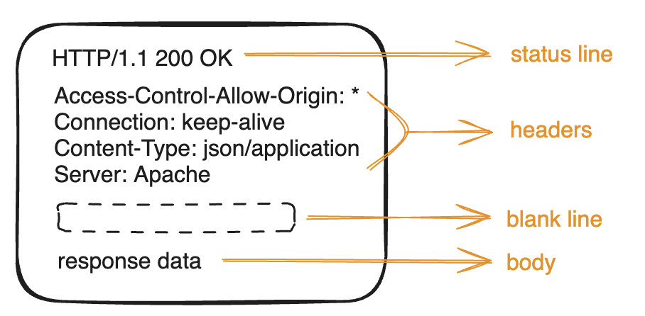 - Status Code : 상태 코드(코드 마다 현재 서버의 상태 나타냅니다. 예를들면 200은 정상, 400은 Client 요청 에러, 500은 서버 에러 등이 있습니다)