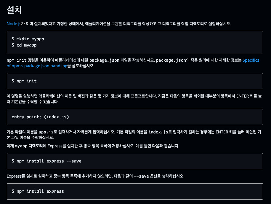 설치 Node.js가 이미 설치되었다고 가정한 상태에서, 애플리케이션을 보관할 디렉토리를 작성하고 그 디렉토리를 작업 디렉토리로 설정하십시오. $ mkdir myapp $ cd myapp npm init 명령을 이용하여 애플