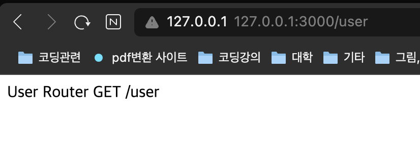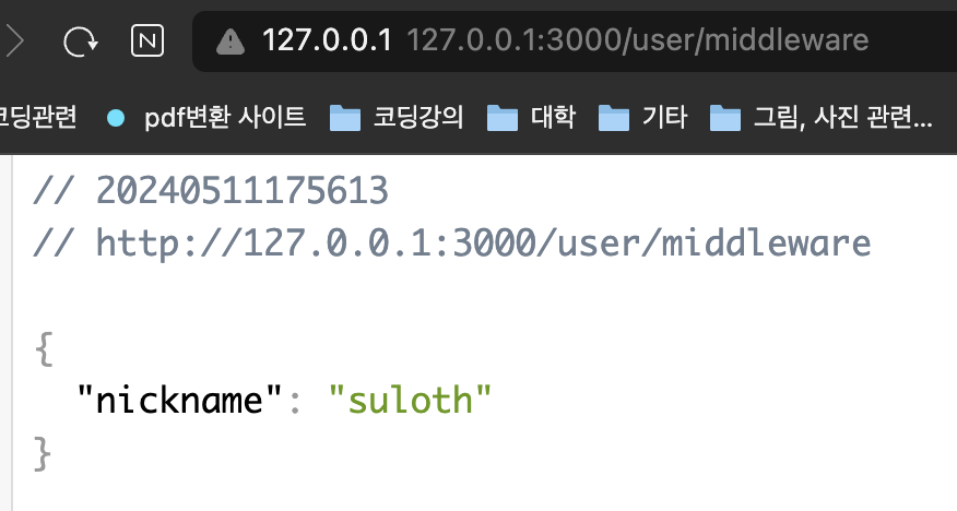 서버를 실행해서 "http://127.0.0.1:3000/user/middleware" 를 브라우저에 입력해주면 다음과 같은 화면이 나타납니다.