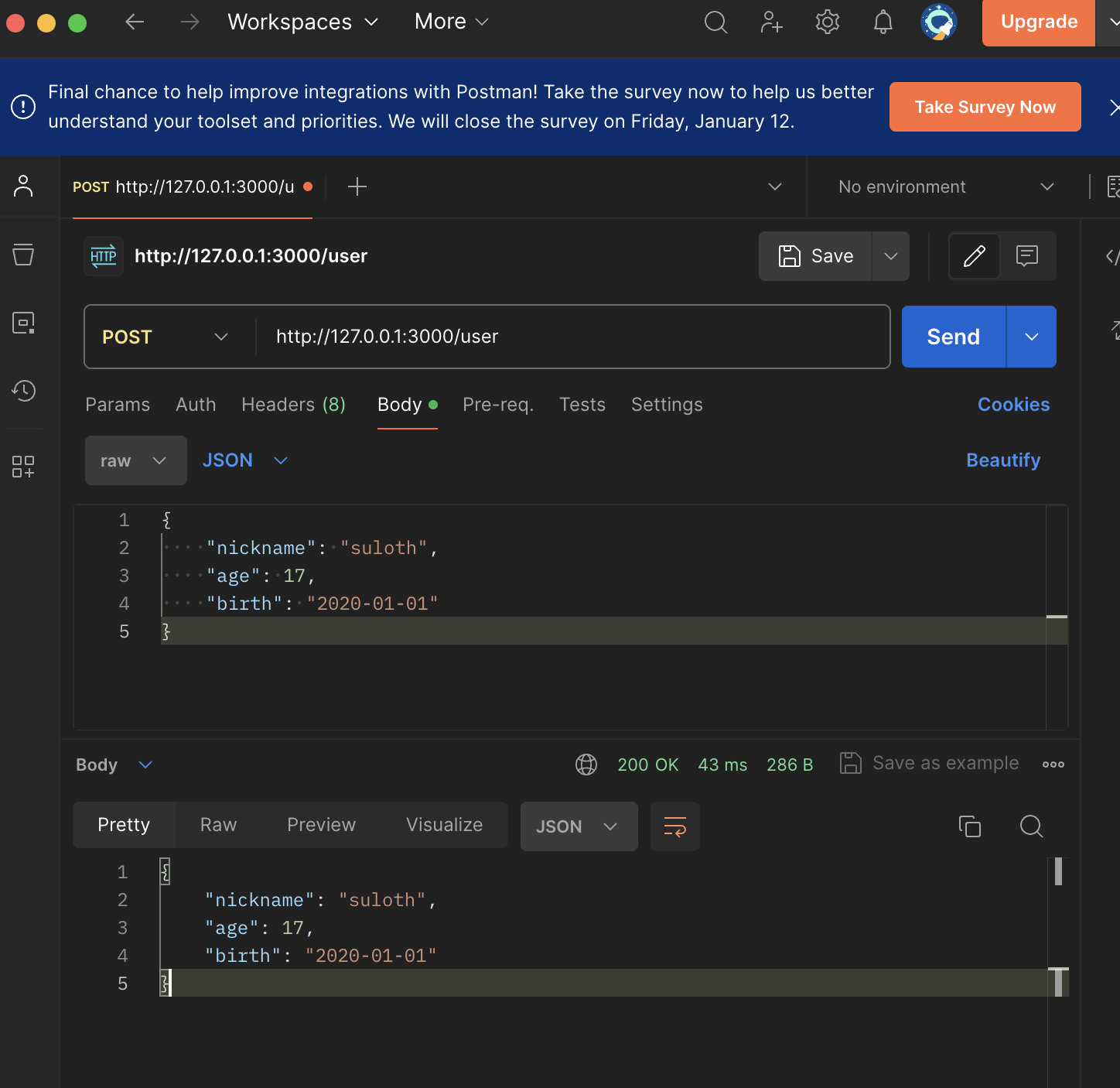 이제 서버를 다시 실행시키고, postman을 켜줍시다. (없다면 설치해주세요)