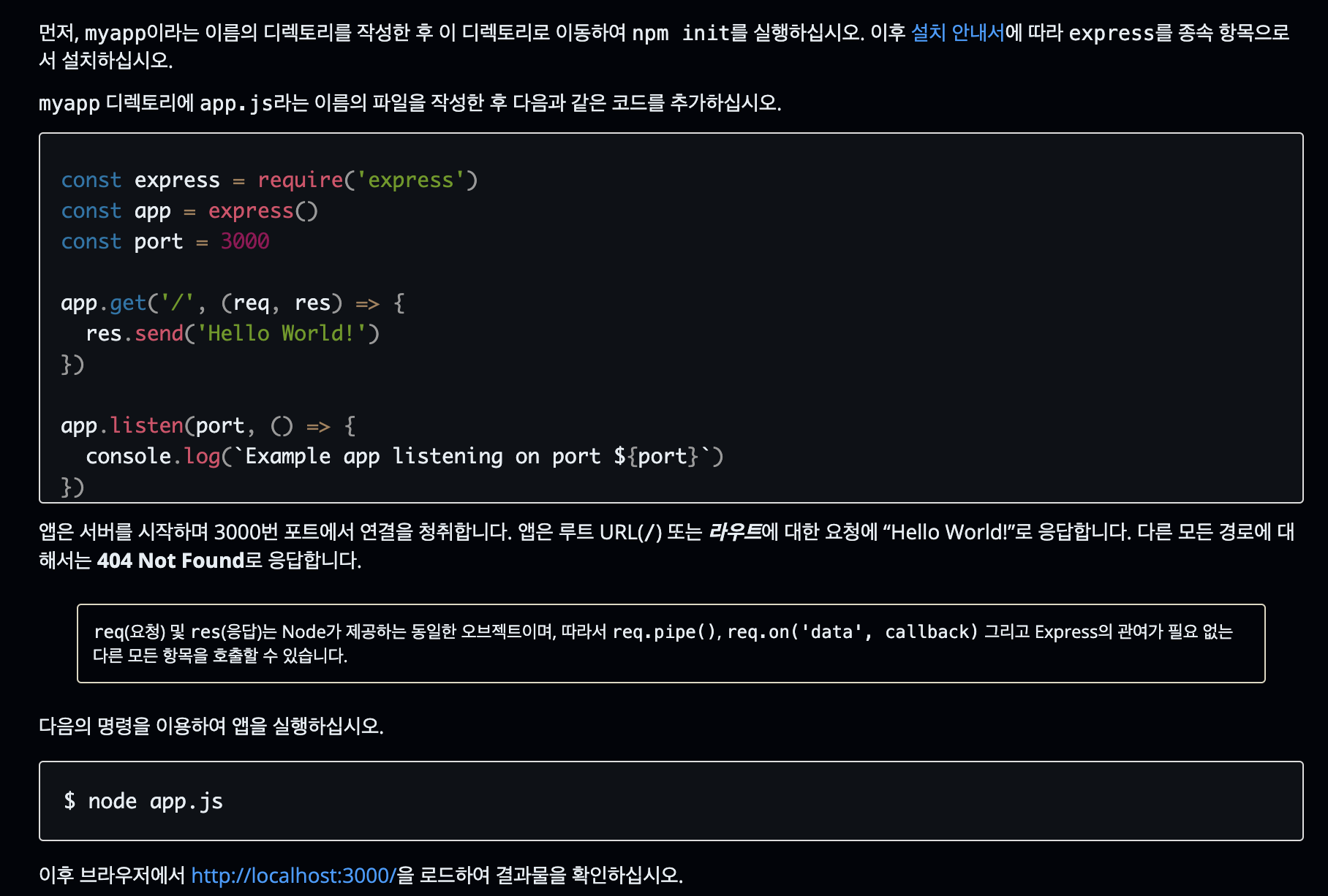 이제 다시 Express.js 공식문서로 돌아와서, 시작하기 -> Hello world를 봐봅시다.