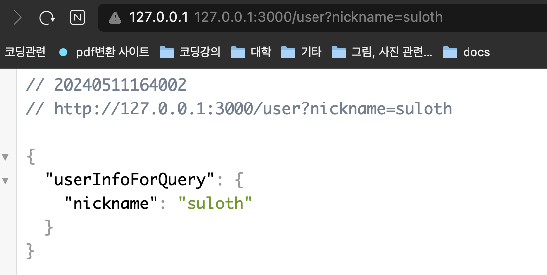위의 router.get("/") 함수를 사용하면 req.query에서 nickname을 읽어서 가져온 다음, json 형식의 데이터를 사용자에게 전달합니다.