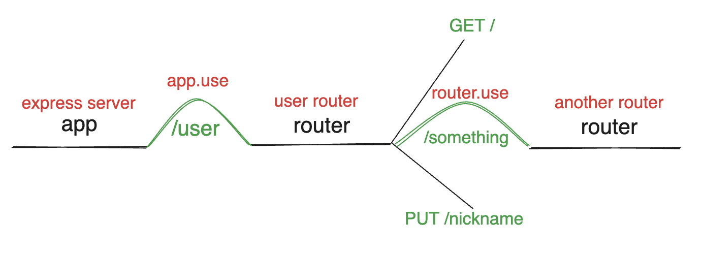 Router에 Router를 붙일수도 있습니다. 그때는 app.use가 아닌 router.use를 사용해주면 됩니다. 길에다가 길을 연결할 수 있잖아요?
