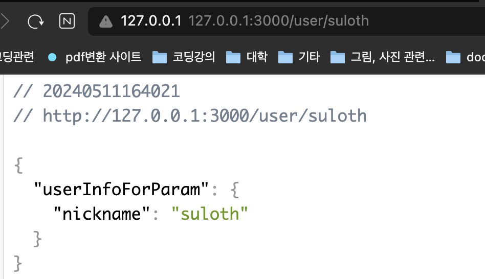 아래의 router.get("/:nickname") 함수를 사용하면 req.param에서 nickname을 읽어서 가져온 다음, json 형식의 데이터를 사용자에게 전달합니다.