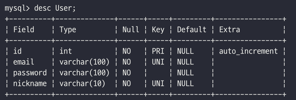 Post 테이블도 마찬가지로 desc 명령을 써서 테이블 구조를 볼 수 있습니다.