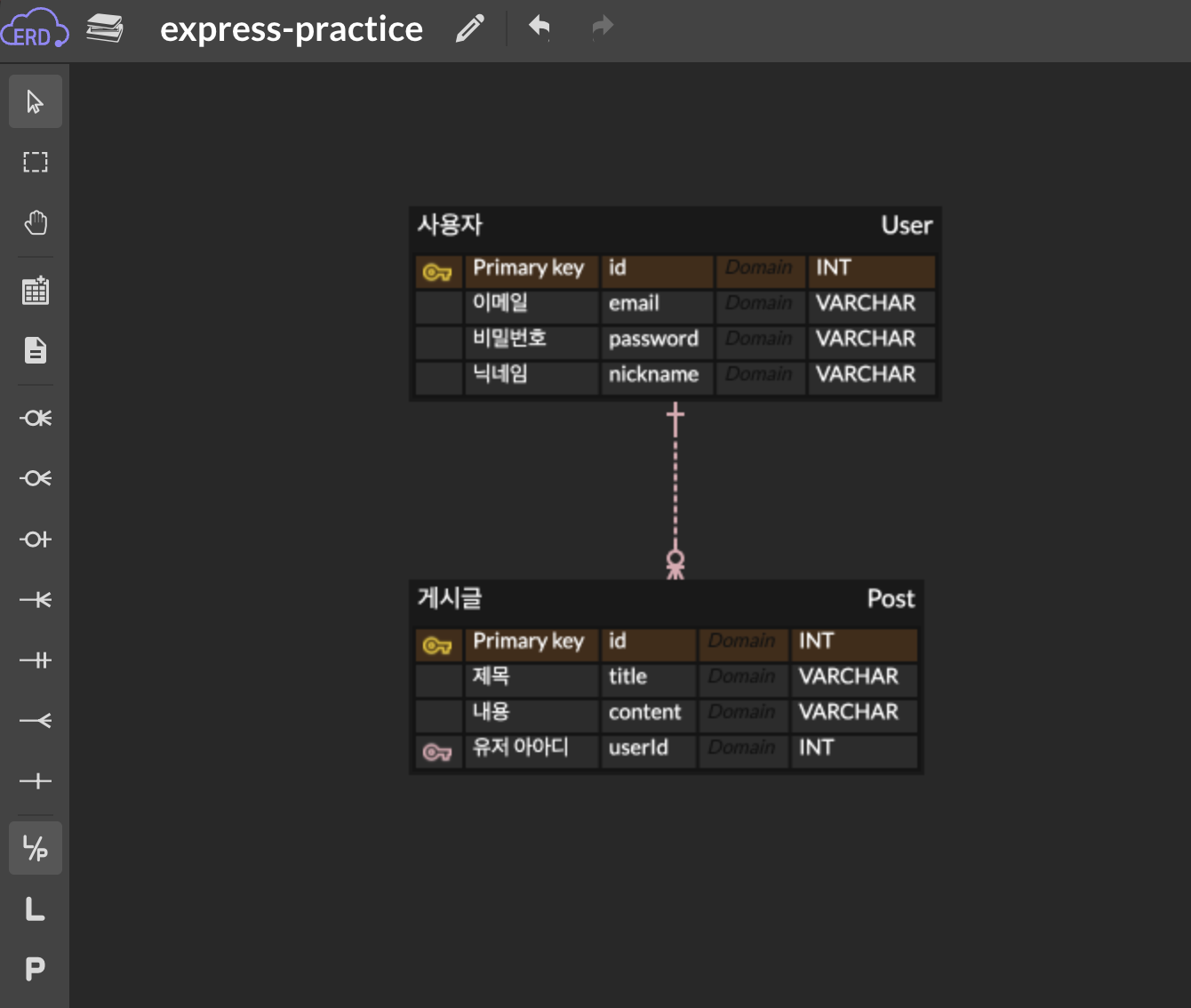 우리는 간단하게 User과 Post 테이블을 만들어보겠습니다. 테이블을 설계하려면, MySQL Workbench 혹은 erdcloud를 이용하도록 합시다.
