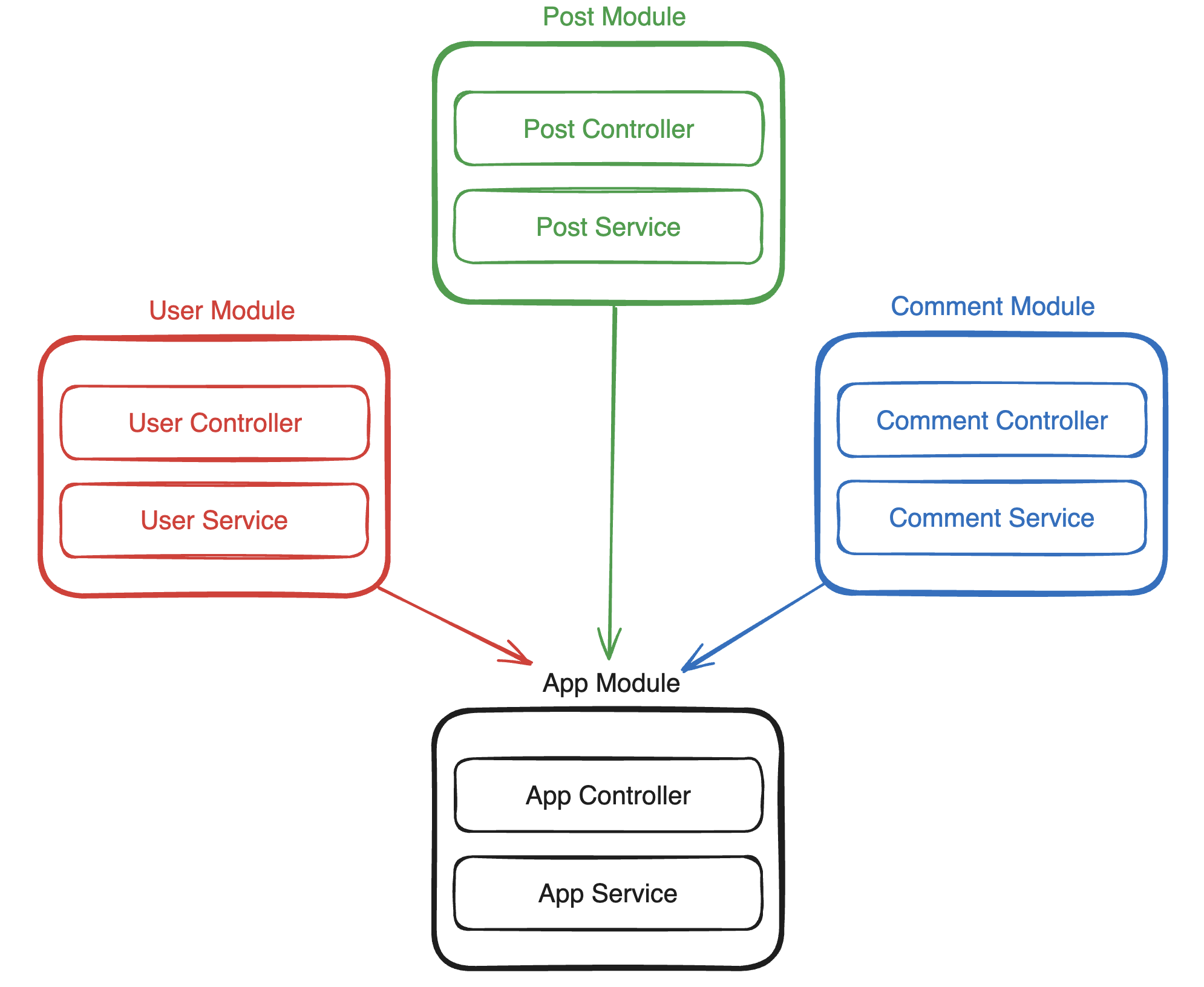 AppModule이 Nest.js 서버가 시작되는 지점이라고 했죠? AppModule에 UserModule, PostModule, CommentModule을 넣어줌으로서 Nest.js 서버가 User, Post, Comment의 컨트롤러를 통해 서비스에 접근할 수 있게 된겁니다.