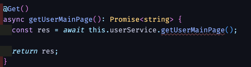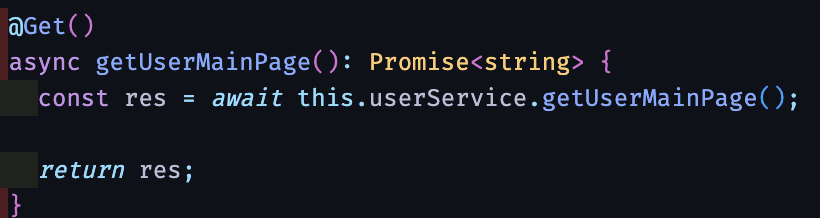 따라서 getuserMainPage의 리턴타입은 Promise<string>입니다. Promise는 비동기의 개념에서 나오는 용어인데, 함수 앞에 적은 async라는 키워드와 관련이 있습니다. 일단은! 외워둡시다. 함수 앞에 async를 적고, 리턴 타입에는 Promise<타입> 을 적는구나~ 라고 생각합시다.