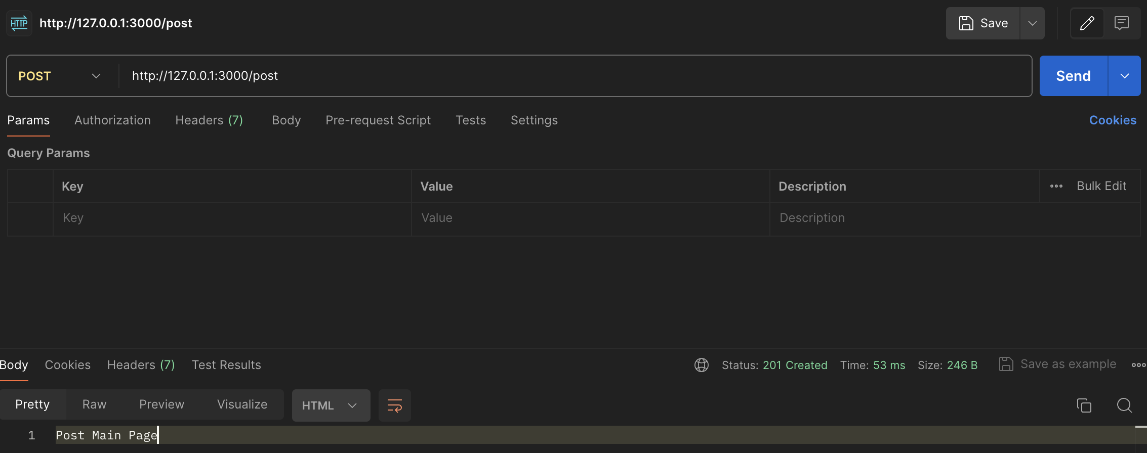 이번에는 /post 경로로 POST 요청을 보내면 Post Main Page라는 문자열을 보내도록 API를 작성해보도록 합시다.