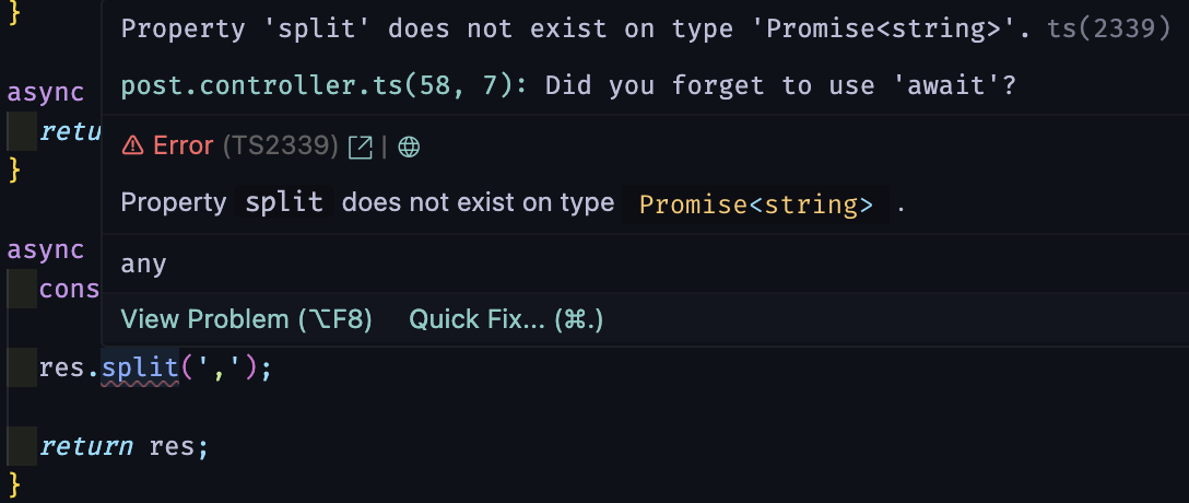 왼쪽 그림에서는 split 함수에 빨간줄이 쳐져있는 것을 확인할 수 있습니다. 에러 메시지를 읽어보면, Promise<string> 타입에는 split이라는 함수가 존재하지 않는다고 되어있네요. 그래서 await을 잊어버리고 안 적은게 아니냐고 물어봅니다.