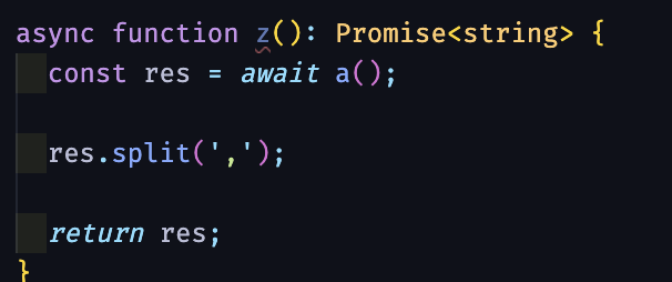 그래서 만약에 x라는 함수에서 y를 참조하고, y라는 함수에서 z를 참조하고, z라는 함수에서 a를 참조하게 되면 x, y, z 함수들도 모두 다 리턴 타입이 Promise로 감싸지게 됩니다. a가 에러를 내뱉으면 x, y, z함수 모두 제 기능을 할 수 없으니까요. 그래서 비동기 관련 로직이 1개만 있어서 관련된 함수는 모두 Promise타입이 됩니다.