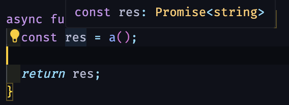 }위 구문을 해석하자면, "a라는 함수는 string을 반환한다고 약속이 되어있는 함수야. 근데, string을 반환하지 않을 수도 있어"라는 뜻입니다. 여기서 주의할 점은, Promise를 리턴타입으로 가지면 함수 앞에 무조건 async 키워드가 있어야한다는 겁니다. (async는 비동기 라는 뜻이라고 생각하면 됩니다)