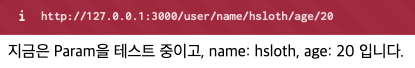 return `지금은 Param을 테스트 중이고, name: ${name}, age: ${age} 입니다.`;