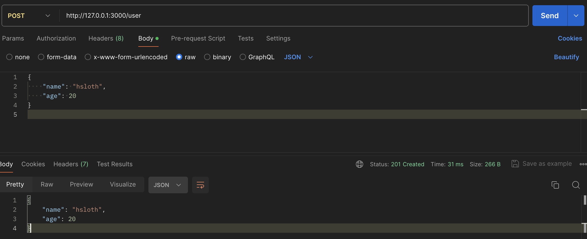 POST http://127.0.0.1:3000/user 로 Body에 name, age를 담아서 보내니 응답이 제대로 왔습니다.