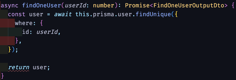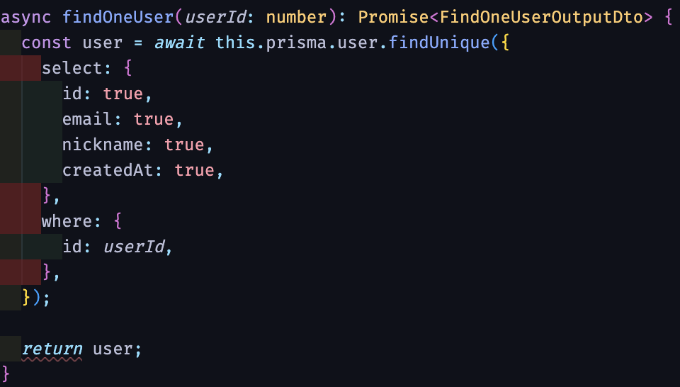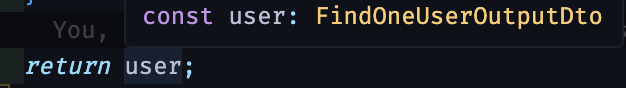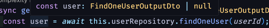 하지만, 중간에 if문을 통해서 user가 null인 경우 에러를 던지는 로직을 작성하였으므로, return 에서 쓰인 user는 FindOneUserOutputDto 타입으로 추론이 되어 빨간줄이 뜨지 않습니다.