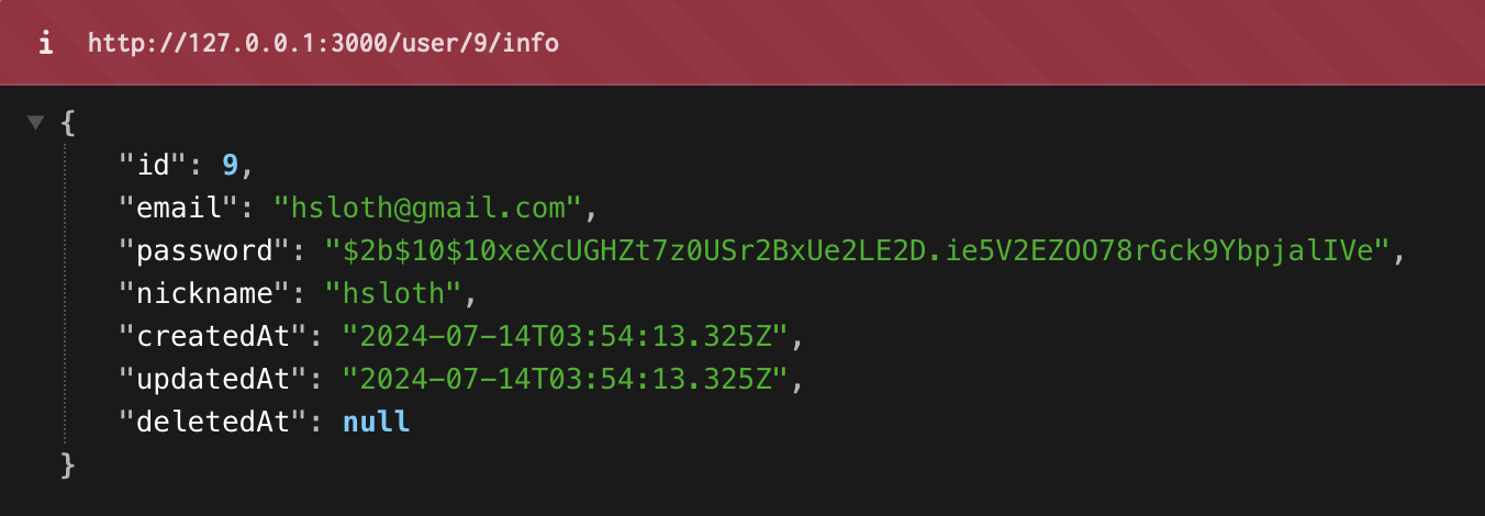 이유는 간단합니다. 우리는 DTO를 통해서 id, email, nickname, createdAt을 리턴하기로 명시해놨는데, 지금 user 변수에는 User에 대한 모든 데이터들이 다 담겨있기 때문입니다.