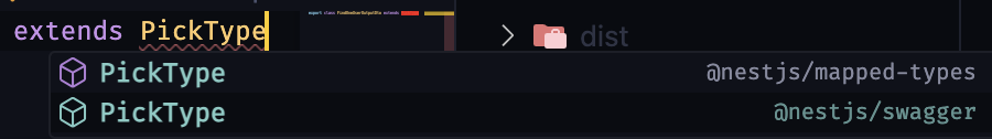 여기서 주의할 점은 PickType을 import할 때, @nestjs/mapped-types가 아닌 @nestjs/swagger로 import 해야한다는 점입니다.