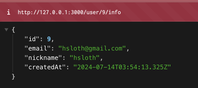그리고 url의 userId에는 DB에서 최근에 만들었던 유저의 id를 입력해줍시다. 저의 경우는 9네요.