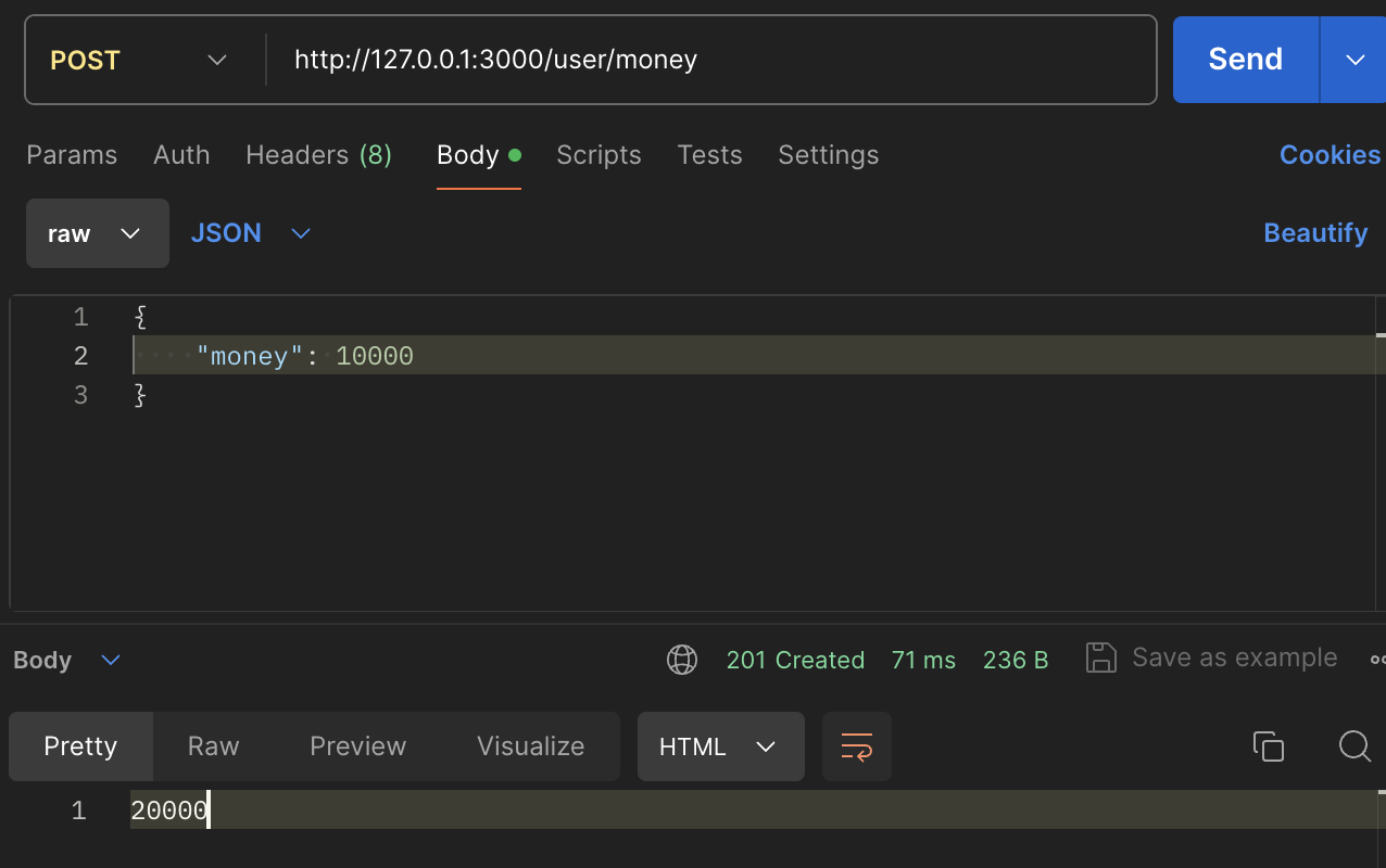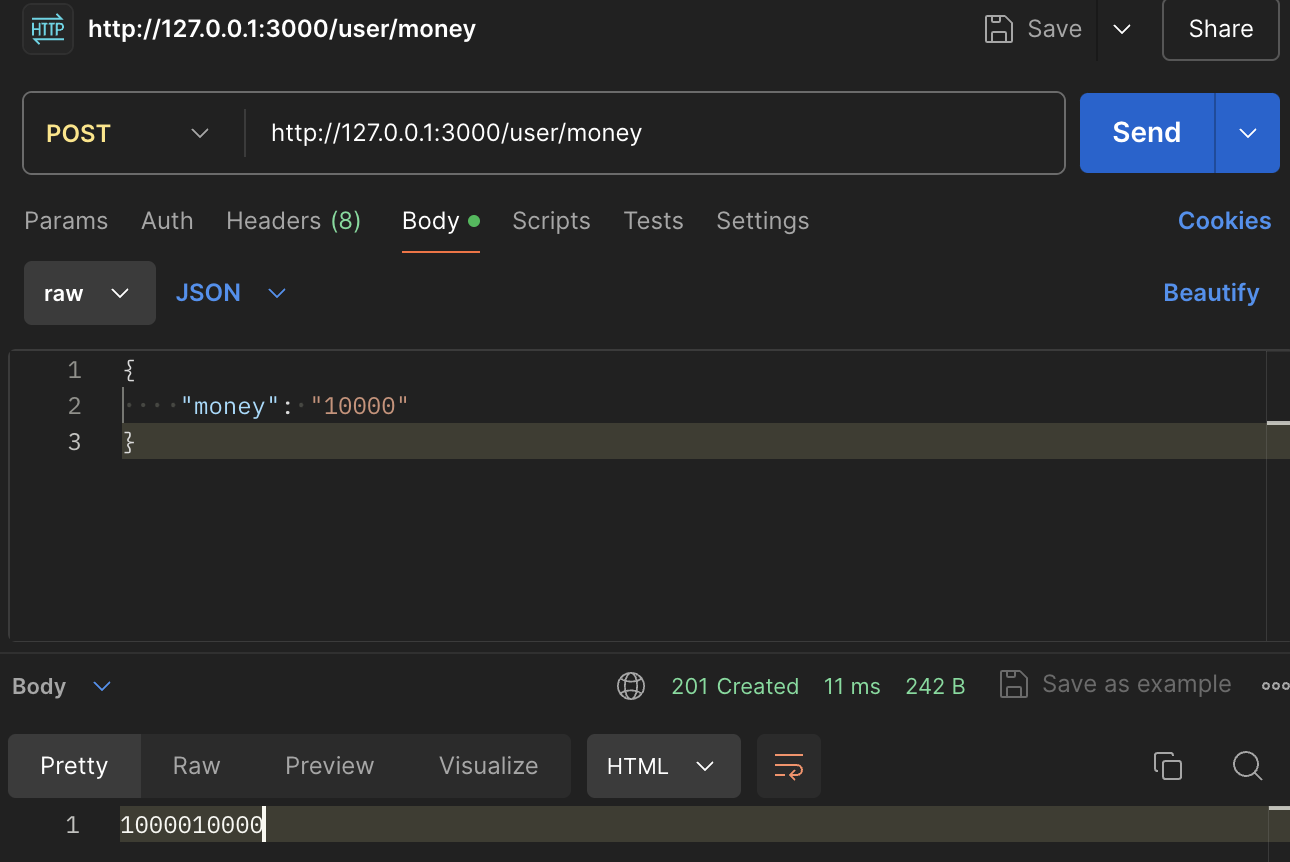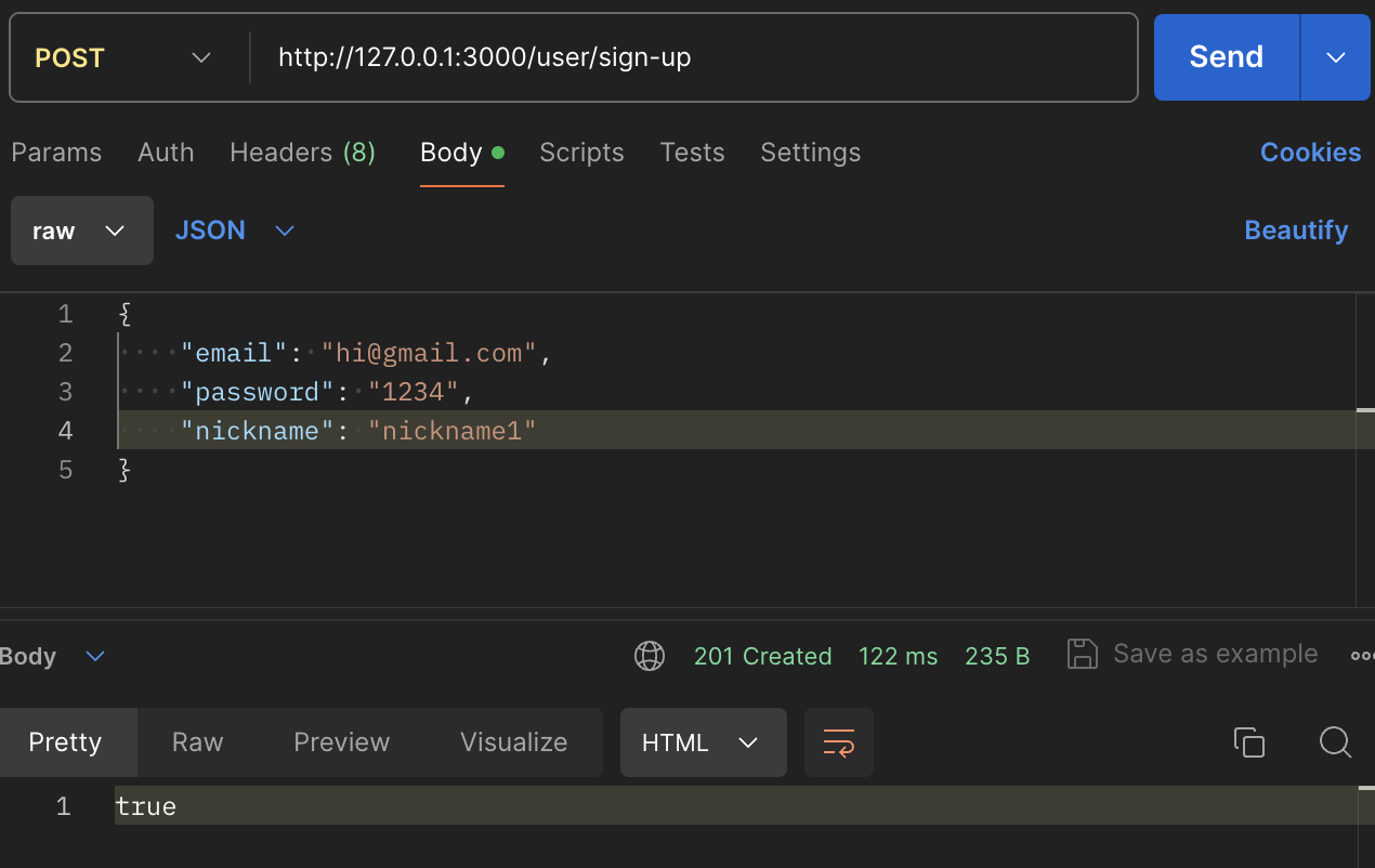 Postman에서 http://127.0.0.1:3000/user/sign-up 으로 Post 요청을 날려봅시다.