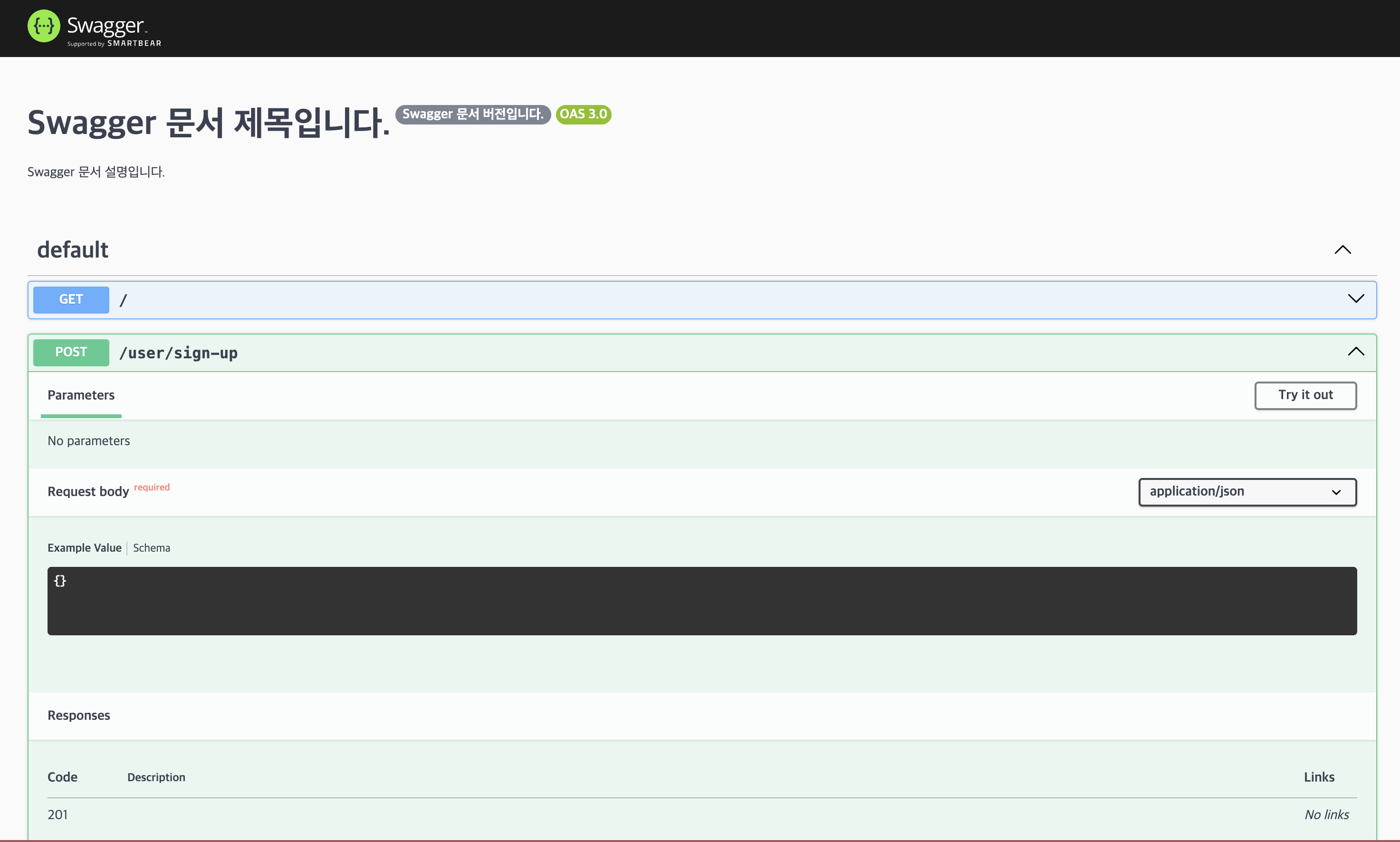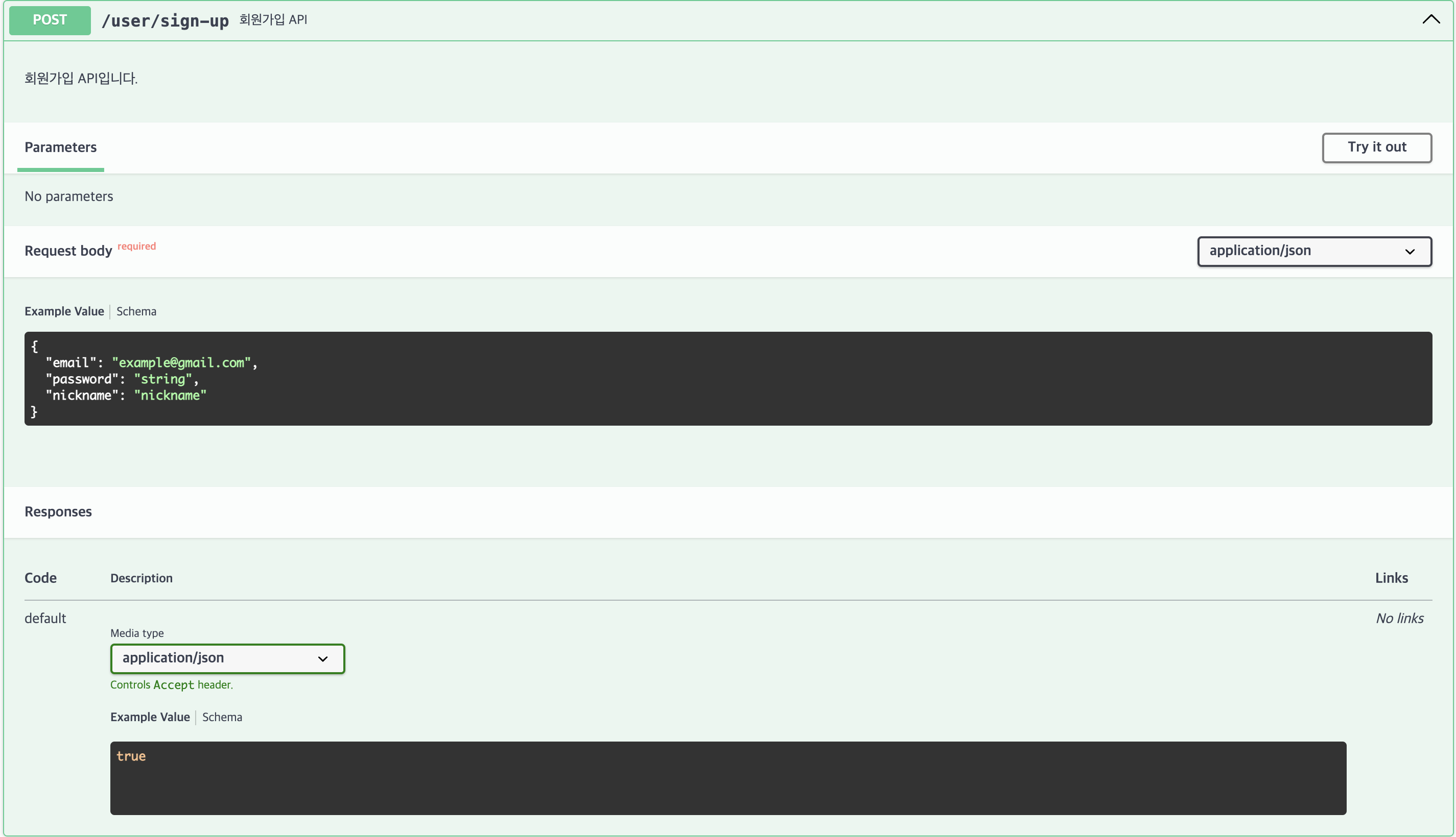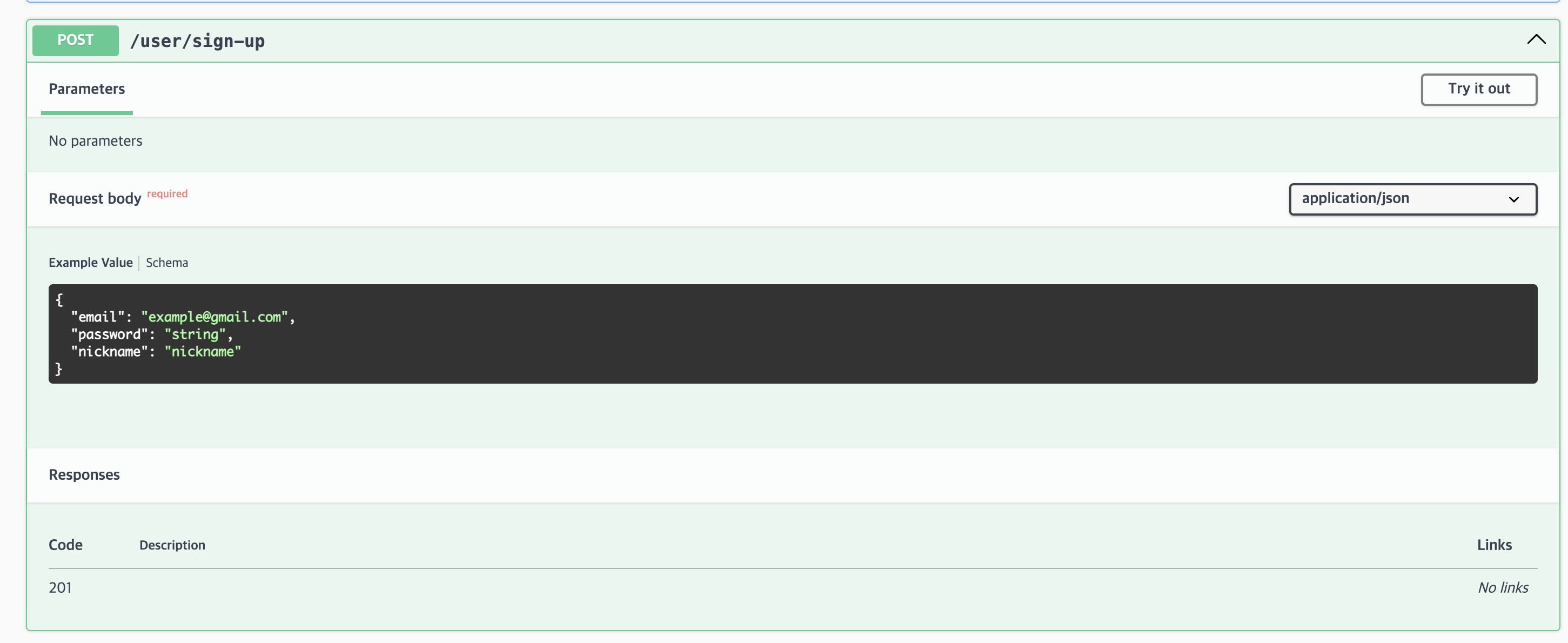 그러면 sign-up의 Request body 부분은 작성을 해주었으니, 이제 Swagger에서 sign-up의 Responses 부분을 작성을 해주어야겠죠!