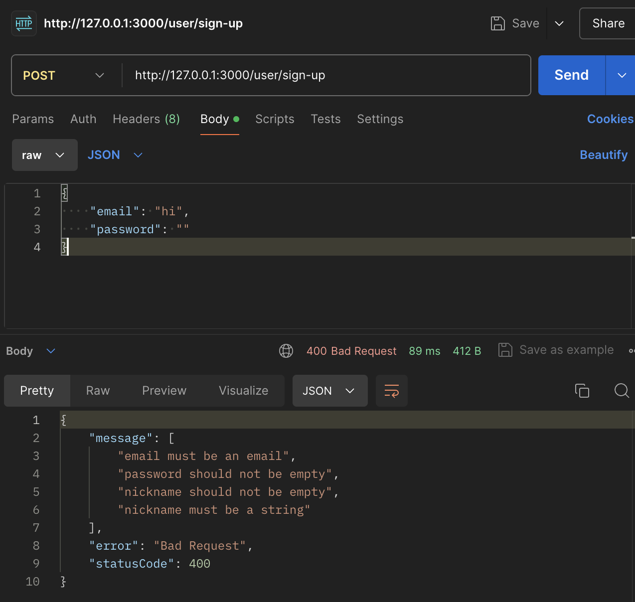 "email must be an email" : body의 email 필드가 email 형식이 아닙니다.