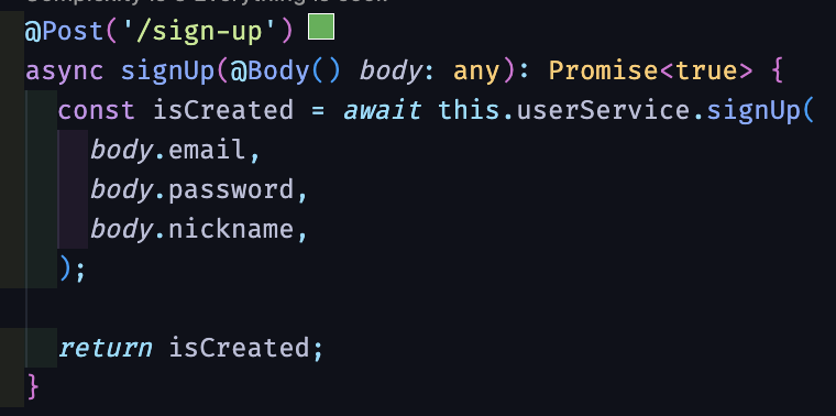 이 DTO는 Controller의 @Body 데코레이터에서 사용할 예정입니다.