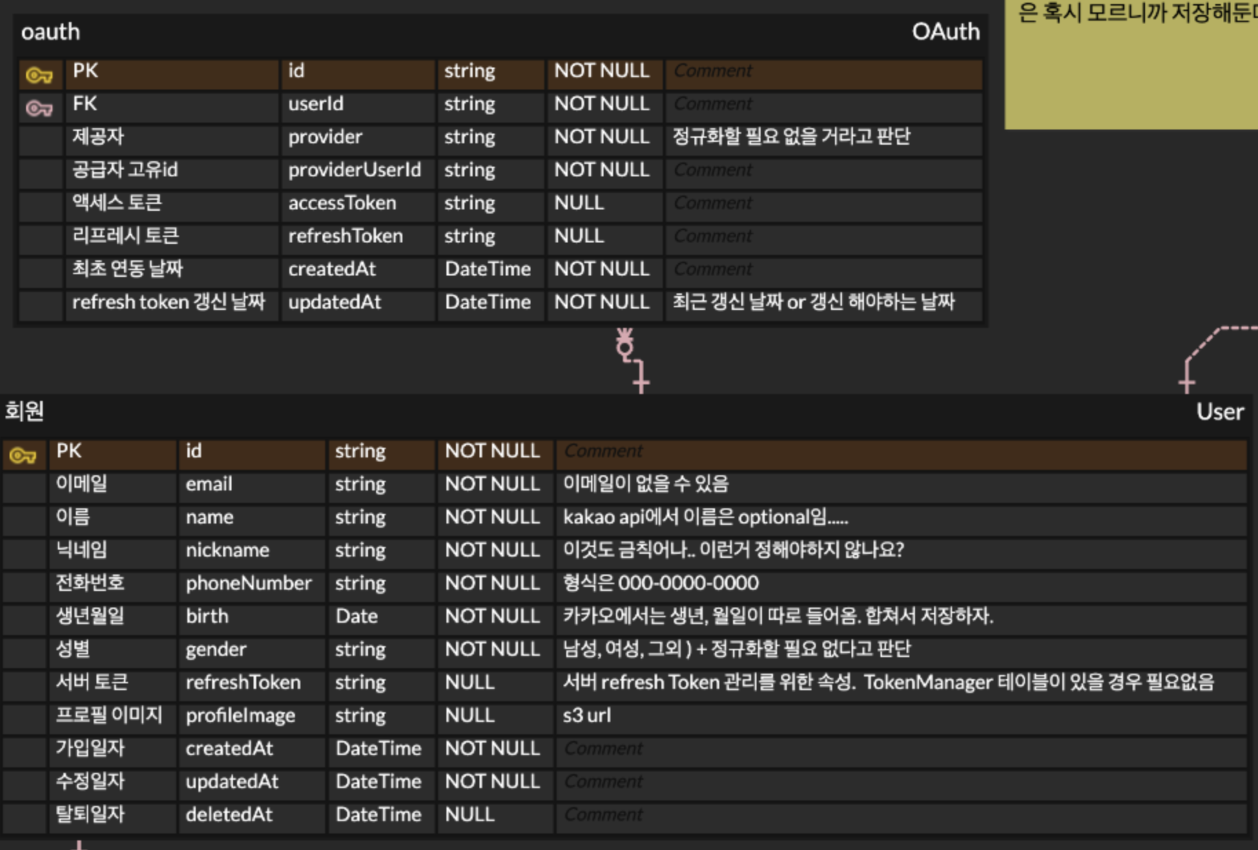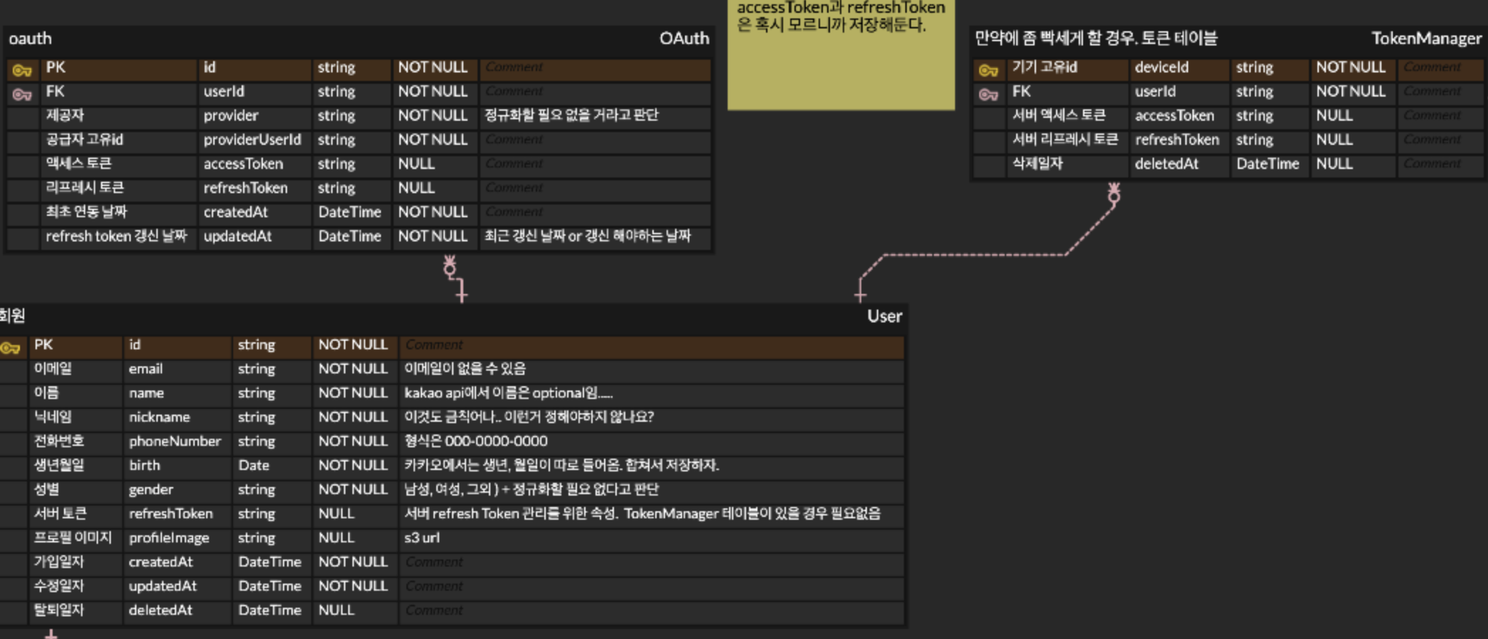 - 간단하다. 유저 테이블에 refresh token 칼럼을 하나 추가해두면 된다. (oauth 테이블은 무시해도 된다)