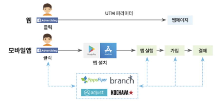 웹에서는 UTM 파라미터, 앱에서는 어트리뷰션이 그 역할을 한다.