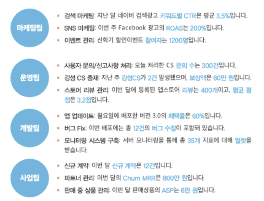각 조직별로 담당하는 업무를 우선 정의한 후 해당 업무를 통해 발생하는 수치들을 지표화해서 관리하는 것