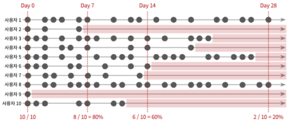 - 기간 : 유지율을 구분해서 보기 위한 날짜 기준. 일별, 주별, 월별 중 적합한 것을 선택한다. 사용자들의 평균 서비스 방문 주기를 고려해서 정하면 된다.