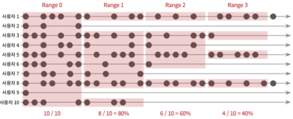범위 리텐션 = Range N에 서비스를 이용한 사람 / Range 0에 처음 서비스를 이용한 사람