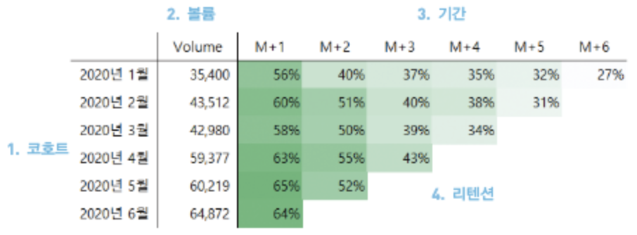 - 불륨 : 각 코호트의 크기. (ex. 2020년 1월 가입자였다면 해당 코호트에 속한 유저 수를 기록)