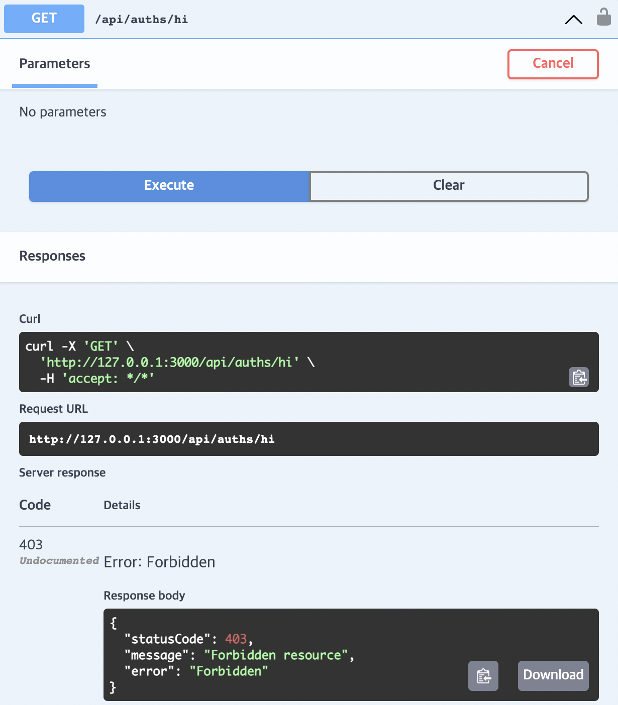 - DocumentBuilder에 addCookieAuth('connect.sid')를 추가한다. 여기서 connect.sid는 고유 식별자이다. express-session은 디폴트로 connect.sid 를 식별자로 사용하기 때문에 따로 설정해주지 않았다면, connect.sid 그대로 적자.