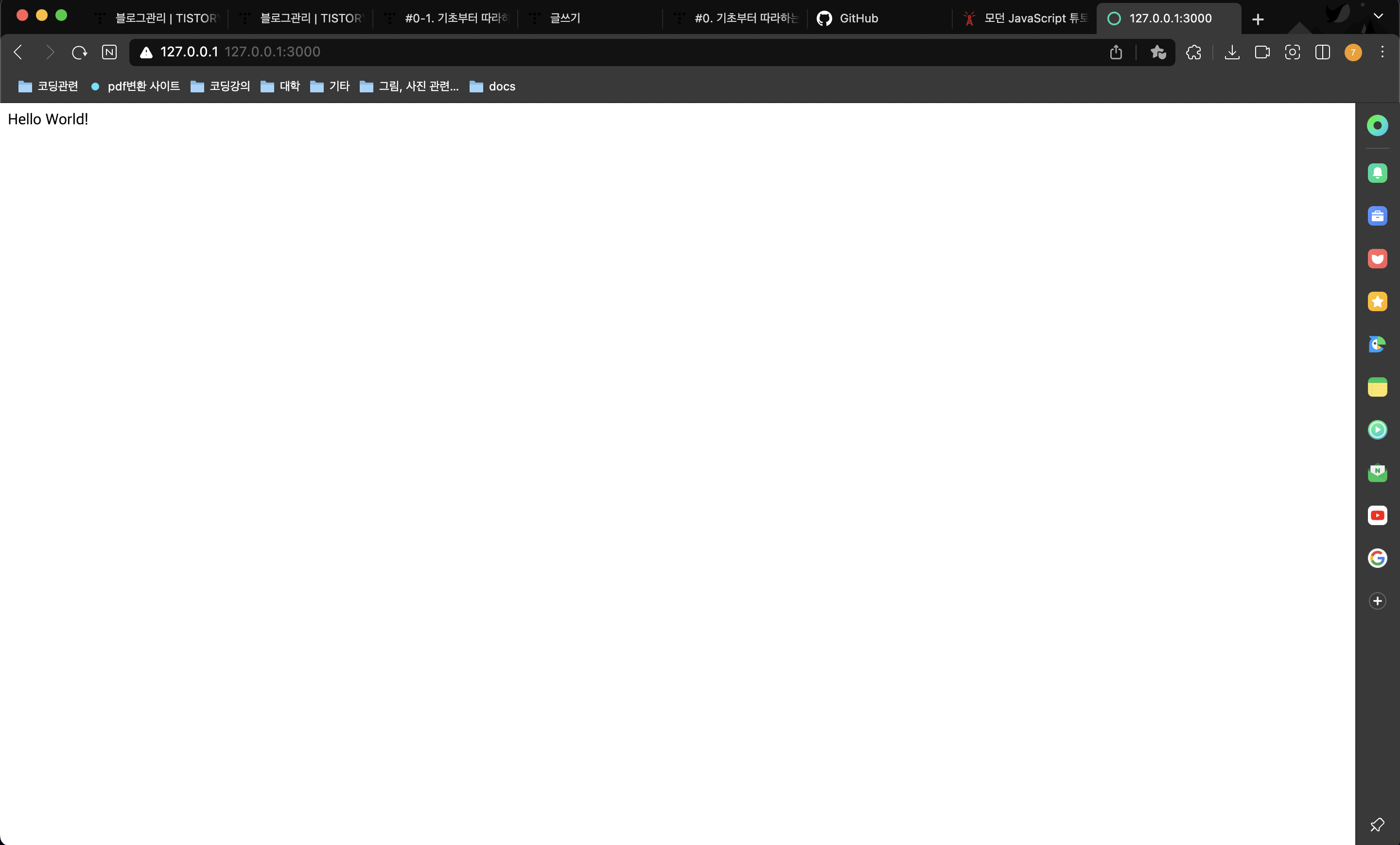 그 후, 브라우저를 열고 주소창에 http:127.0.0.1:3000 혹은 http://localhost:3000 을 입력하면 다음과 같은 화면이 뜹니다.